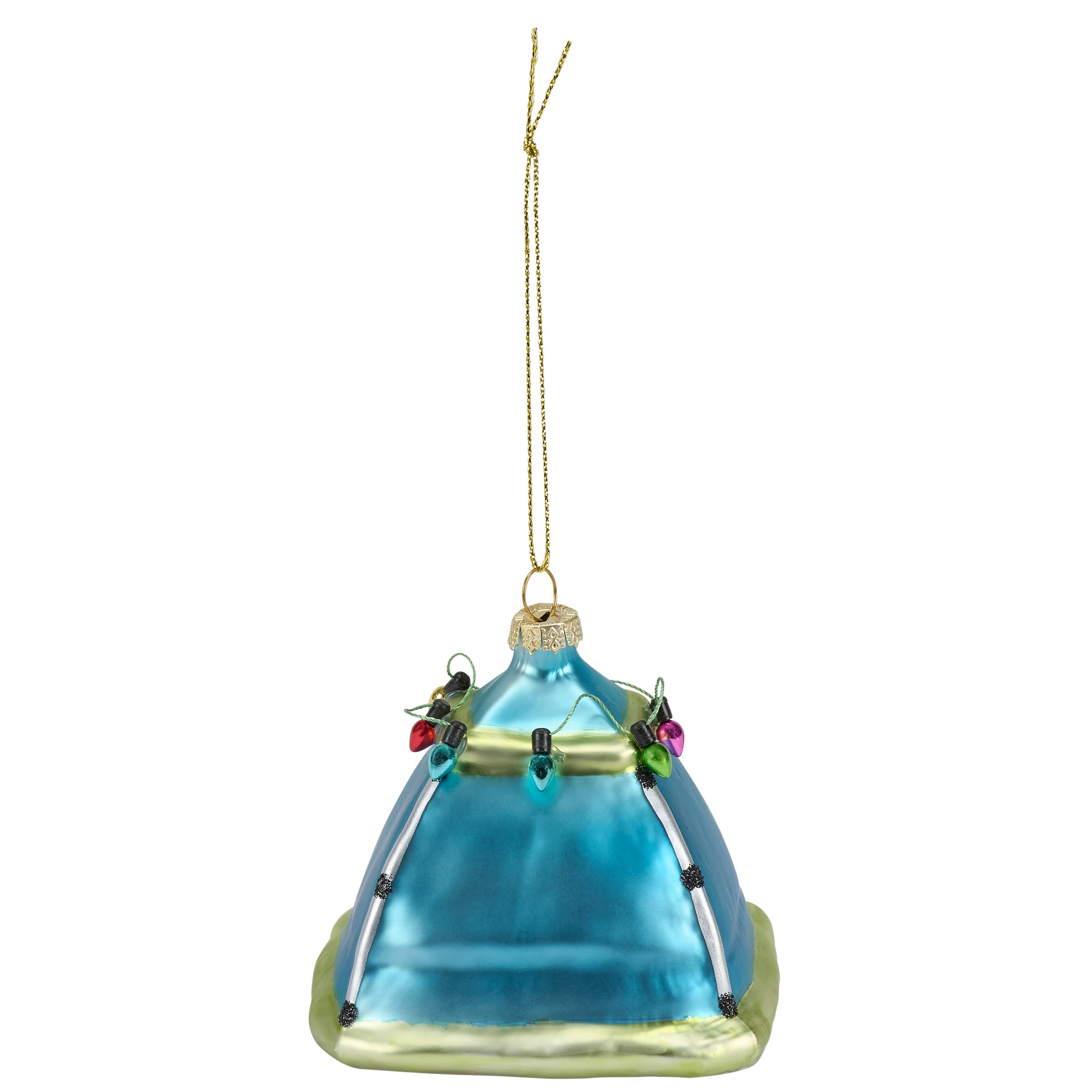 A glass ornament from our Lake & Cabin Collection displaying a fun camping tent design with painted details and glitter accents. Our glass Camping Tent ornament is ready to hang for display via the included top loop and string hanger. A vintage style gift perfect for adding personality to a Christmas tree or for camping themed displays.