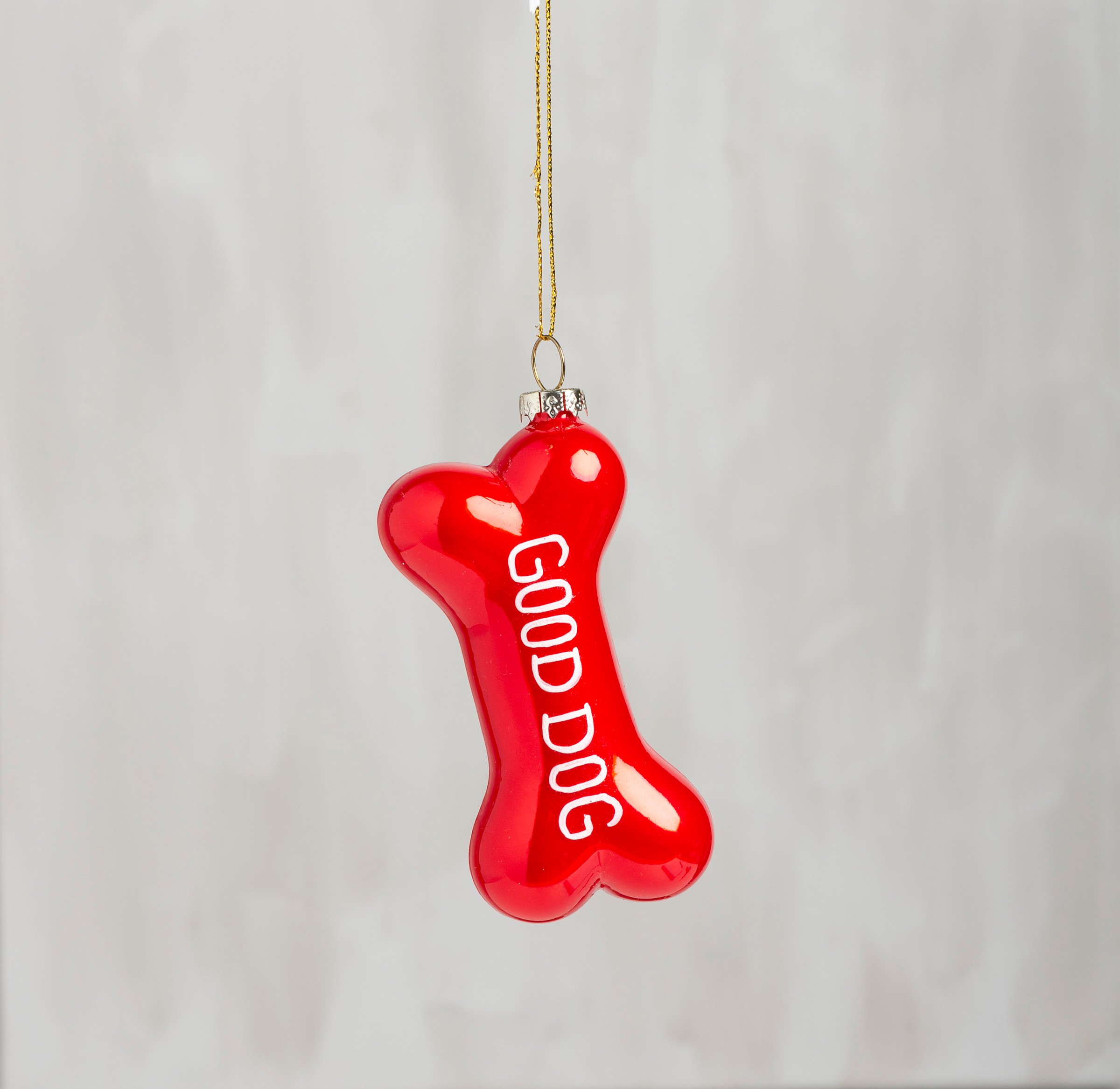 A red glass Dog bone ornament from our Christmas Collection featuring a "Good Dog" sentiment. The glass Dog Bone ornament contains top loop for easy hanging.