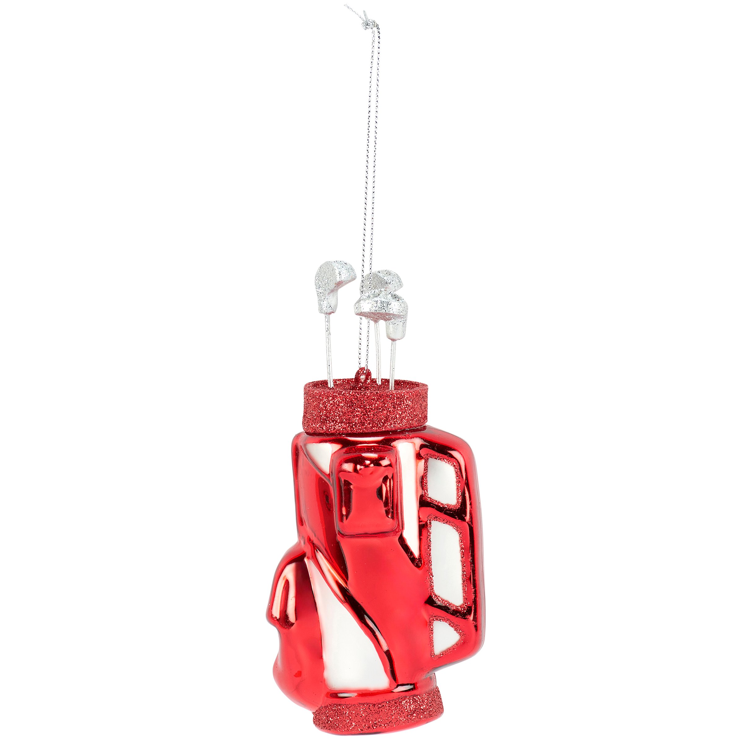 A glass ornament from our Christmas Collection displaying a fun golf bag design with painted details and glitter accents. Our glass Golf Bag ornament is ready to hang for display via the included top loop. A fun golf-themed gift perfect for adding personality to a Christmas tree.