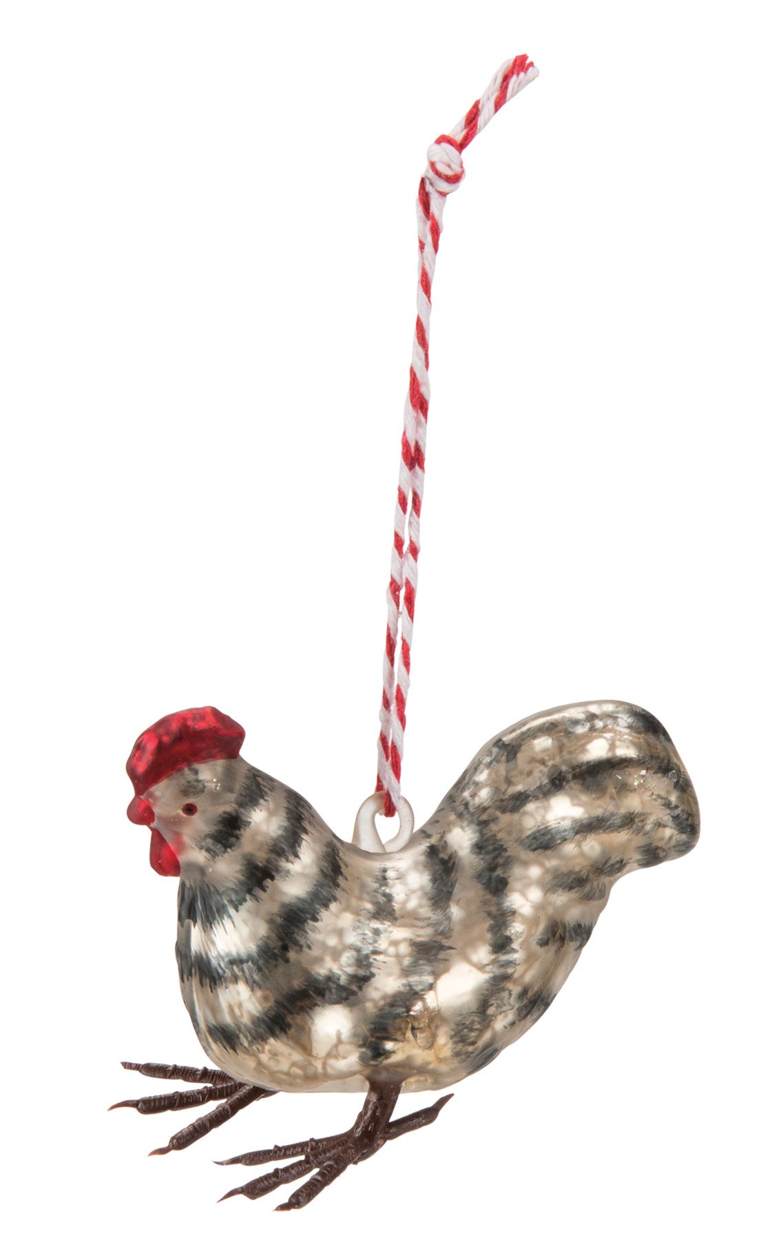 A glass ornament from our Christmas Collection featuring a black and white feathered hen. The glass Hen ornament has top loop for easy hanging and decorating.