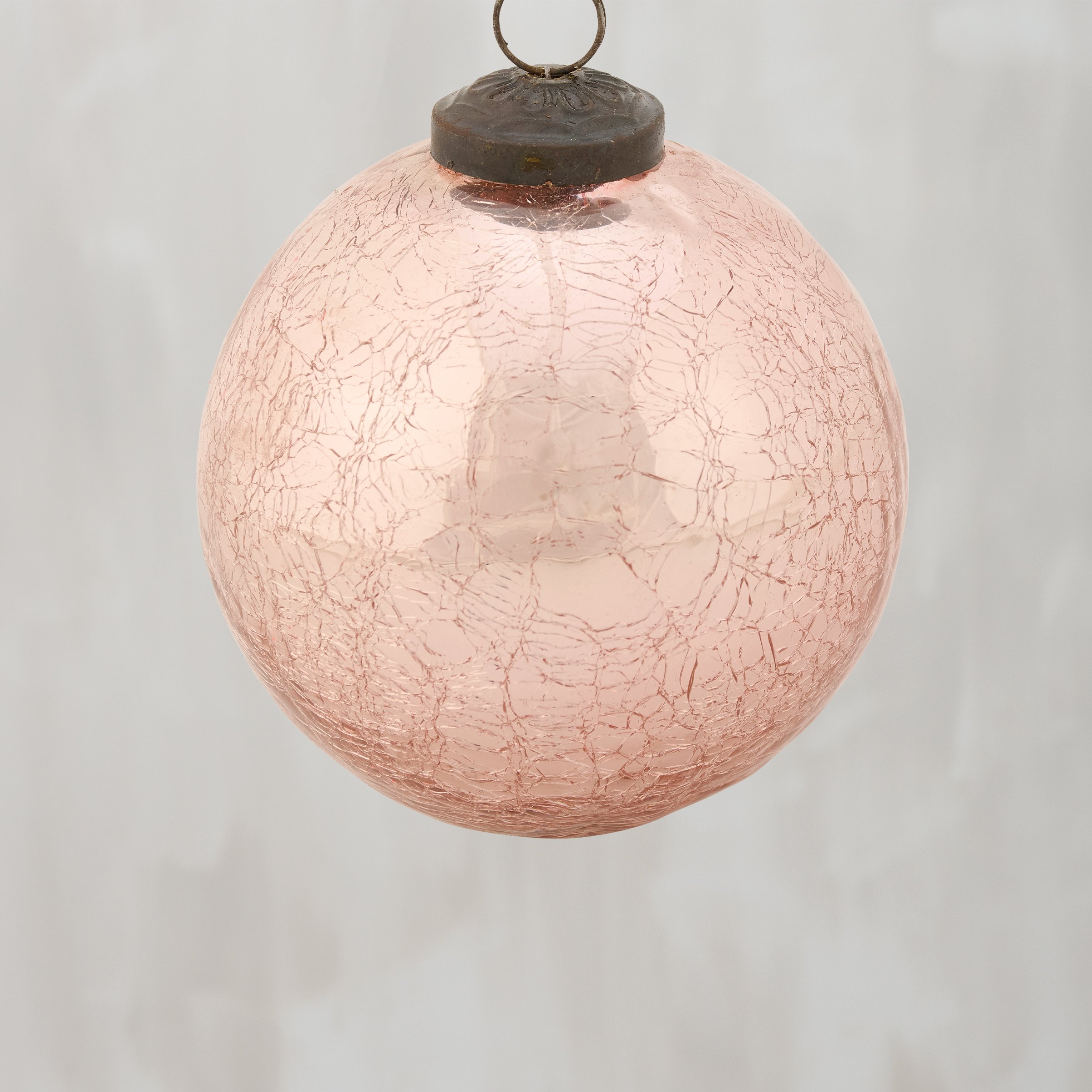 A large glass ornament from our Christmas Collection displaying a vintage Christmas ball design with a retro pastel pink color and distressed details. Our large glass Pink Ball ornament is ready to hang for display via the included top loop. A retro pastel seasonal home accent perfect for a Christmas tree or for gifting.