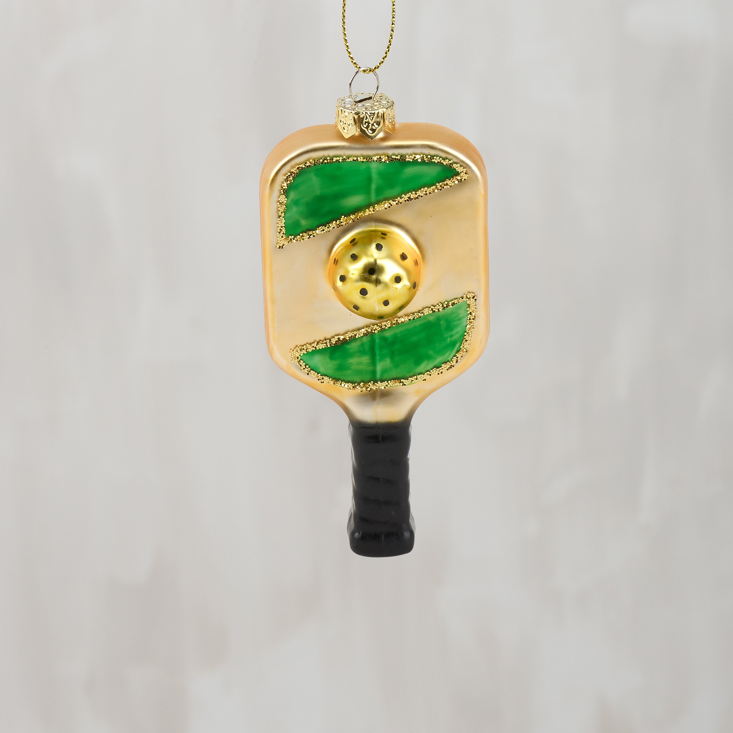 A glass ornament from our Christmas Collection displaying a pickleball inspired design of a pickleball on a paddle featuring painted details and glitter accents. Our glass Pickleball Paddle ornament is ready to hang for display via the included top loop and string hanger. A vintage style gift perfect for adding personality to a Christmas tree or for everyday pickleball themed displays.