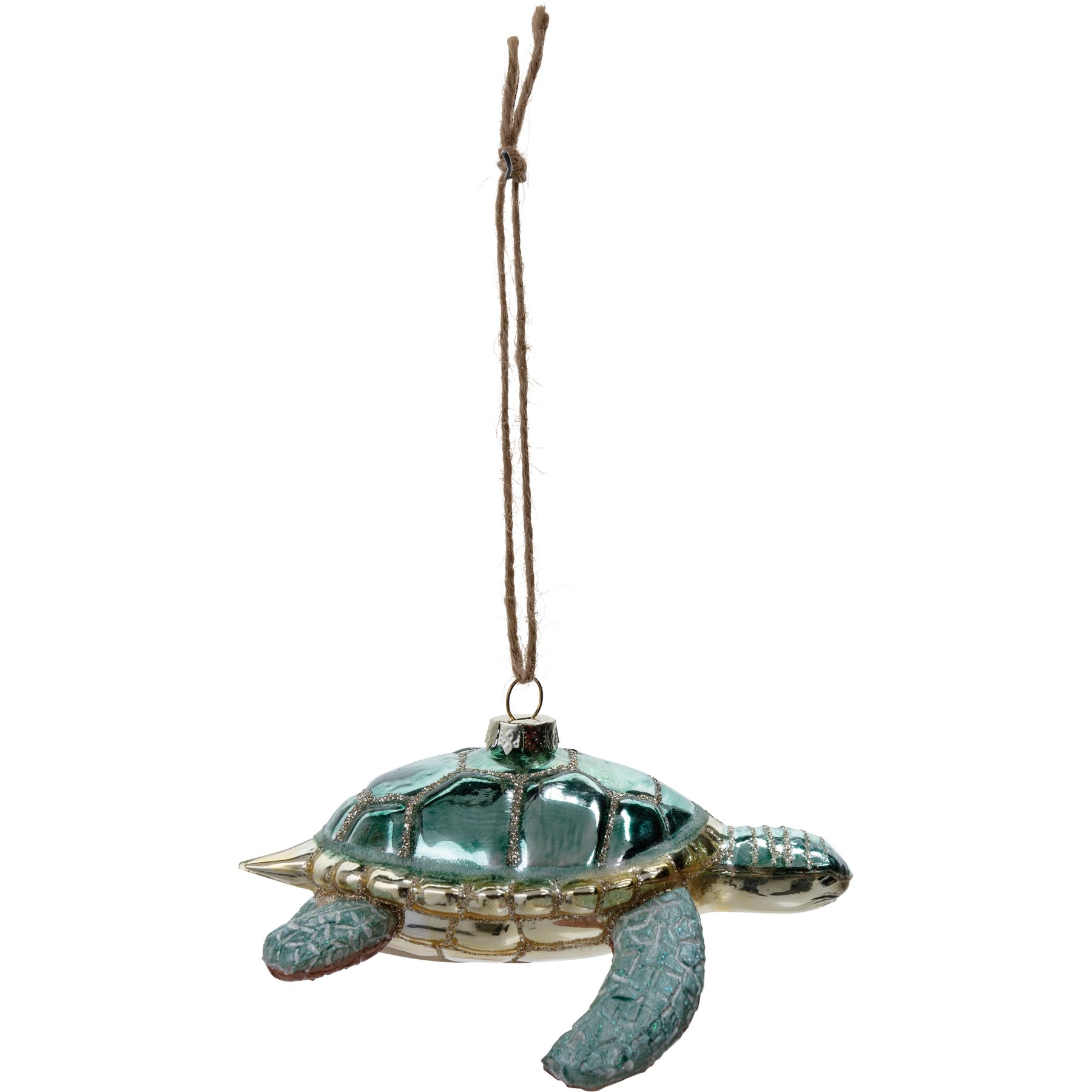 A glass ornament from our Christmas Collection displaying a design of sea turtle with glitter accents. Our Glass Sea Turtle ornament is ready to hang via the included top loop. A fun seasonal home accent perfect for a Christmas tree or for gifting.