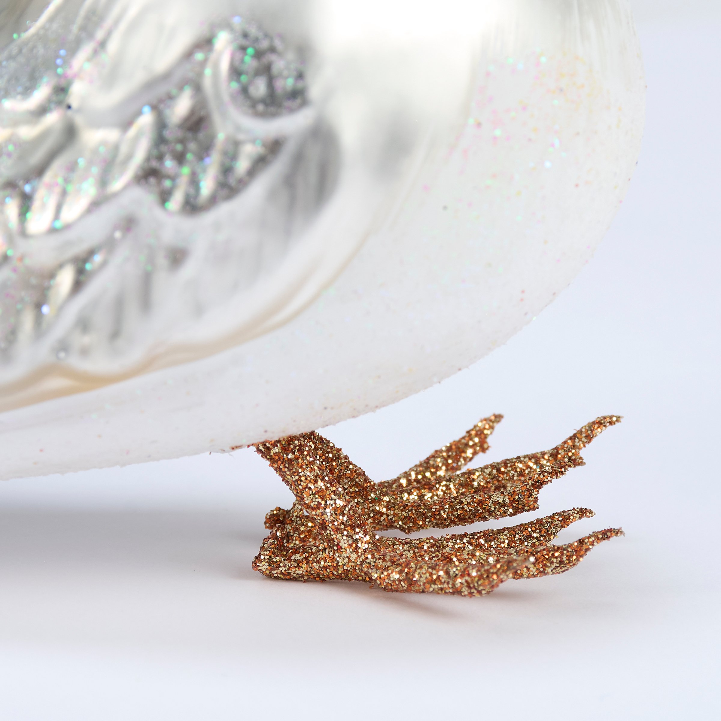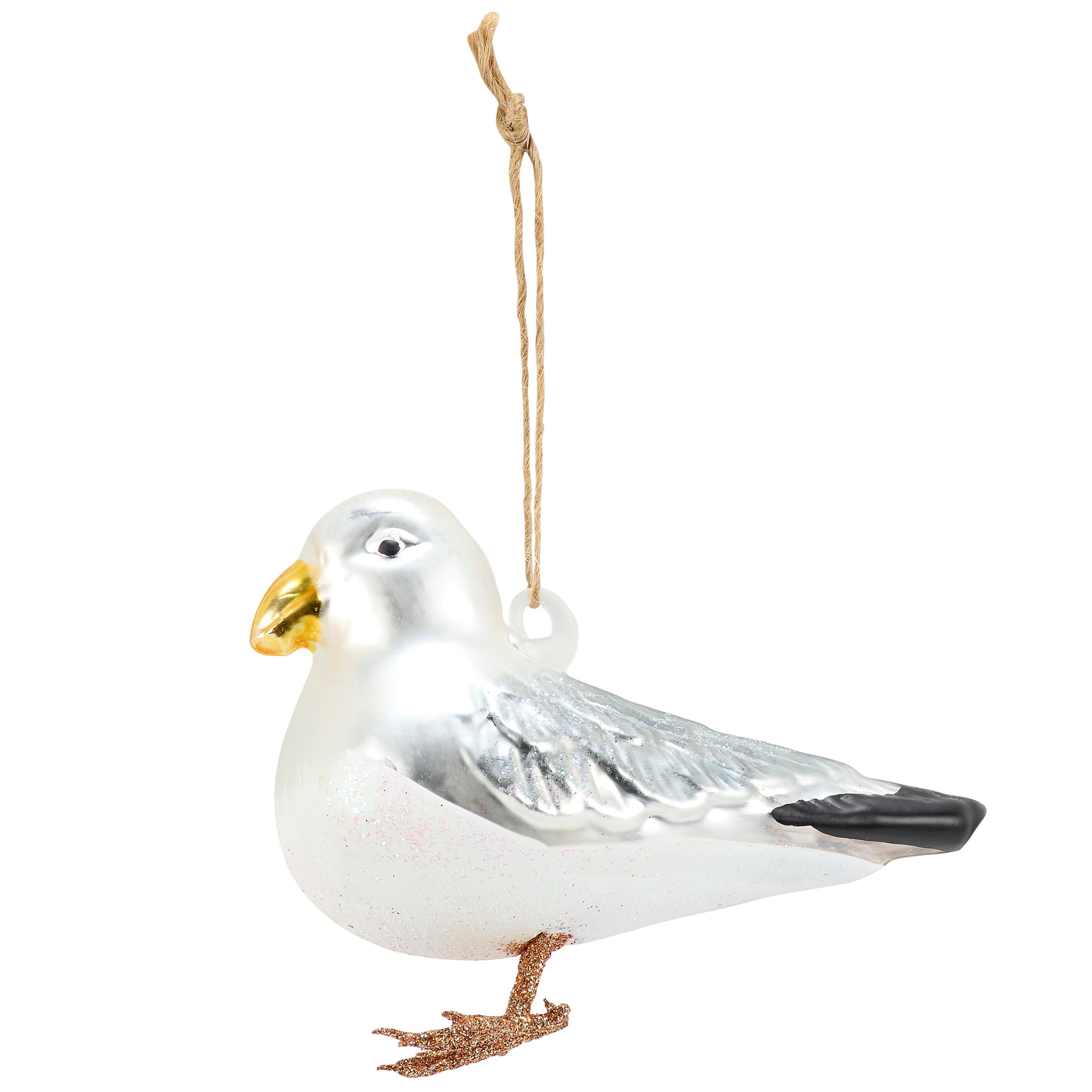 A glass ornament from our Beach Collection displaying a beach inspired design of a seagull with glitter accents and painted details. Our glass Seagull ornament is ready to hang for display via the included top loop. A vintage style gift perfect for adding personality to a Christmas tree or for everyday beach-themed displays.