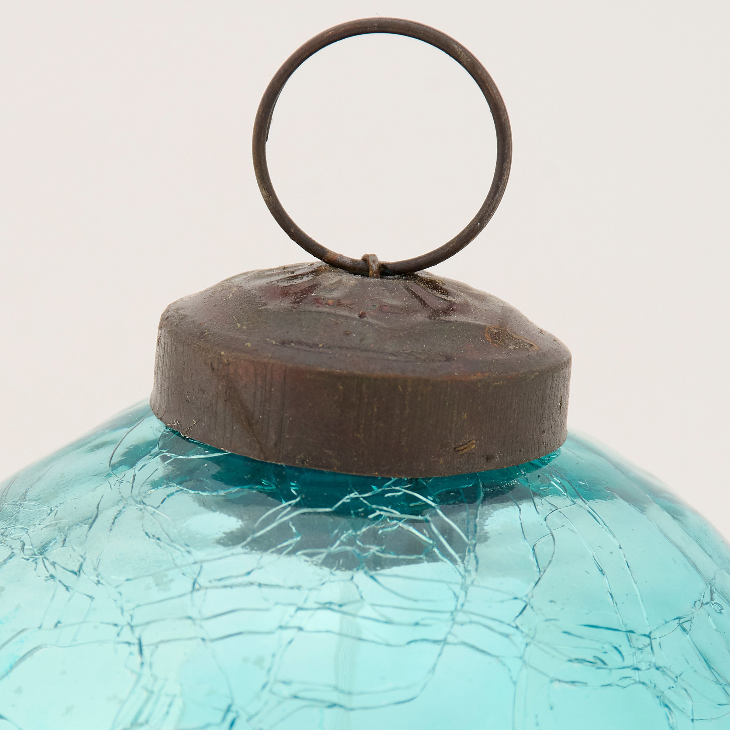 A small glass ornament from our Christmas Collection displaying a vintage Christmas ball design with a retro pastel blue color and distressed details. Our small glass Blue Ball ornament is ready to hang for display via the included top loop. A retro pastel seasonal home accent perfect for a Christmas tree or for gifting.