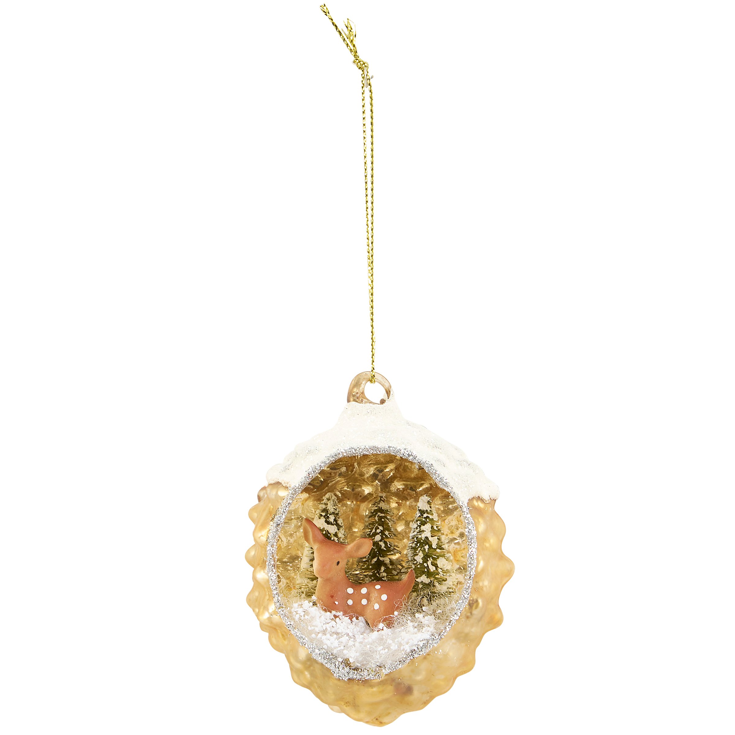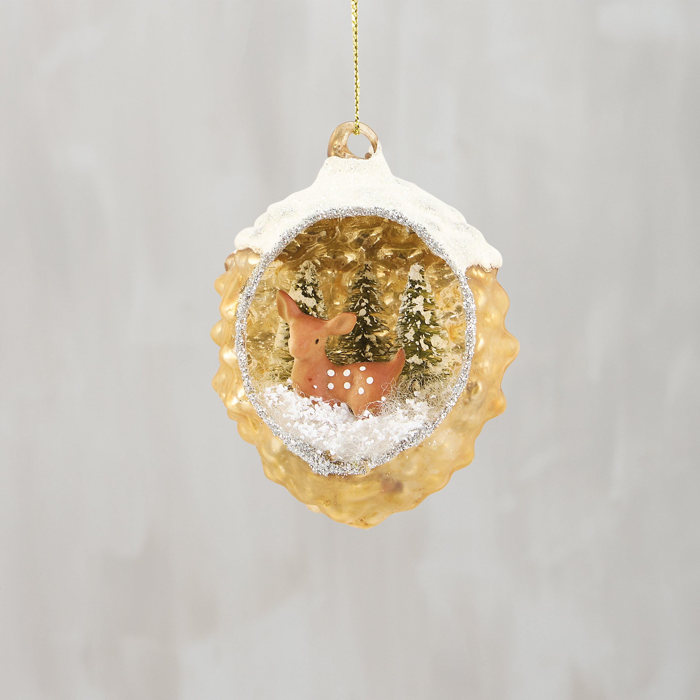 A glass ornament from our Christmas Collection displaying a vintage blub design featuring a sculpted deer inside with bristle trees and snow creating a charming winter scene. Our glass Snowy Deer ornament is ready to hang for display via the included top loop. A vintage seasonal home accent perfect for a Christmas tree or for gifting.