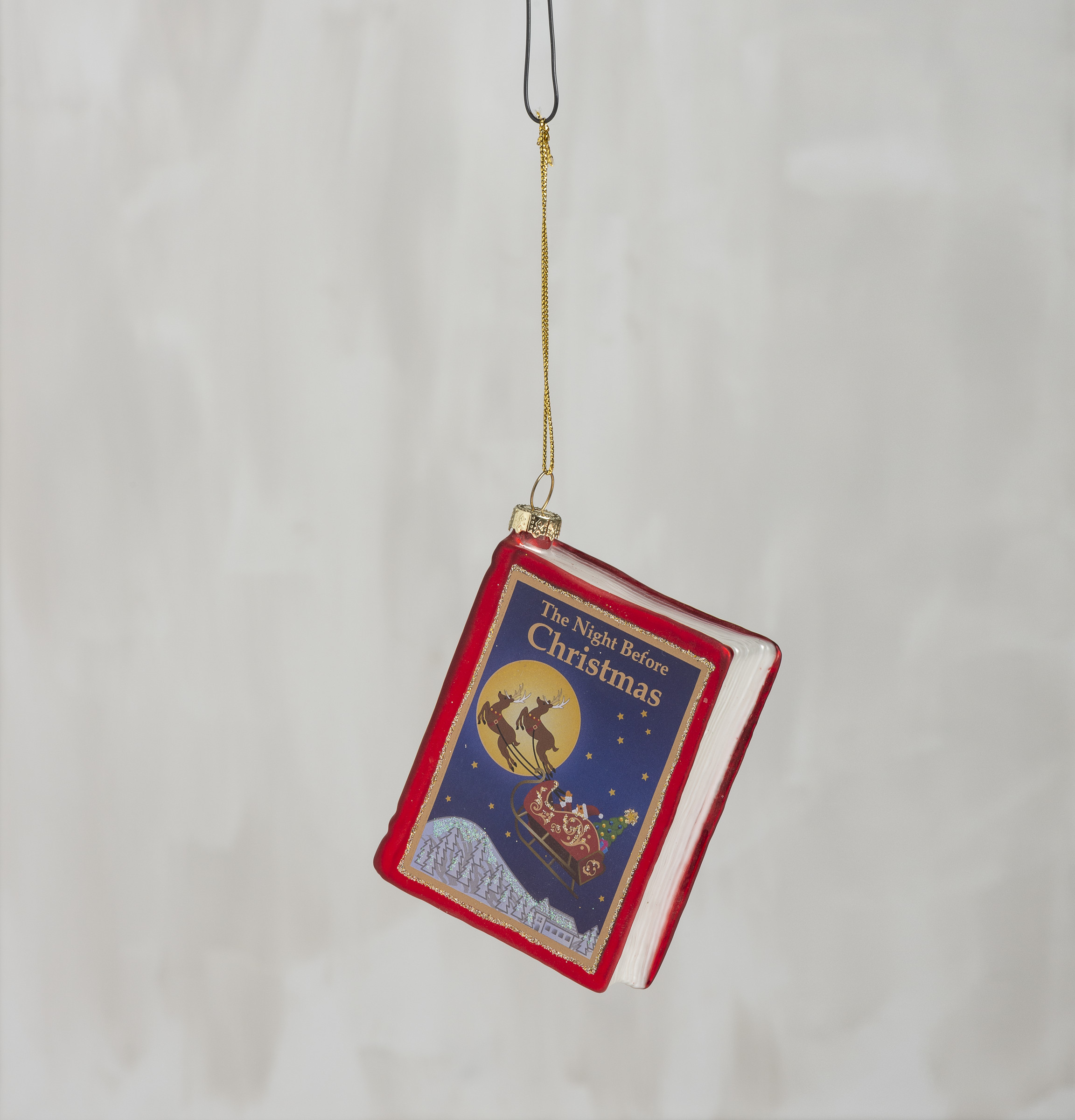 A glass storybook ornament for Christmas featuring glitter details. Contains top loop for easy hanging.