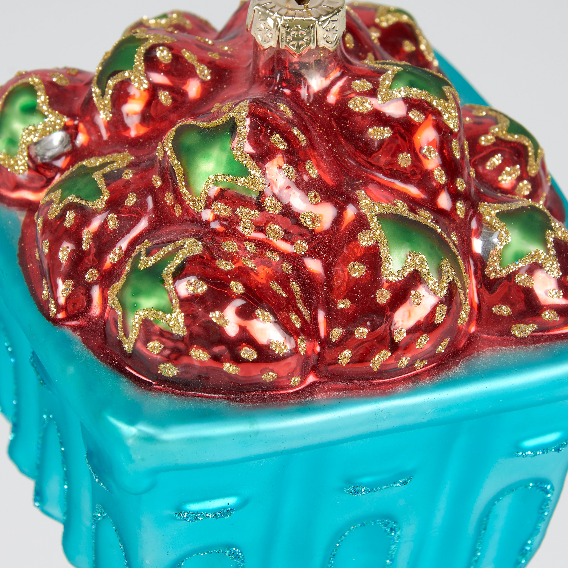 A glass ornament from our Christmas Collection displaying a design of strawberries in a berry basket with glitter accents. Our glass Strawberry ornament is ready to hang via the included top loop. A fun seasonal home accent perfect for a Christmas tree or for gifting.