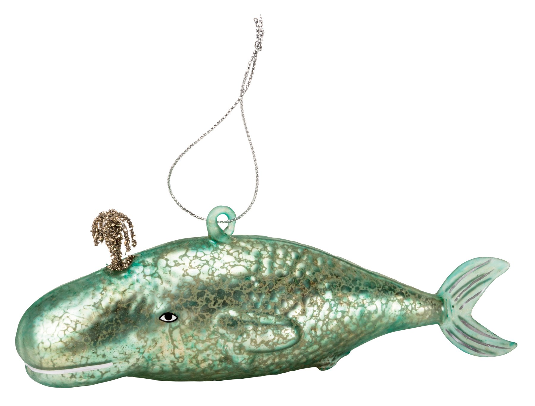 A coated glass whale shark Christmas ornament with tinsel details that's perfect for a beach-themed Christmas or to gift.