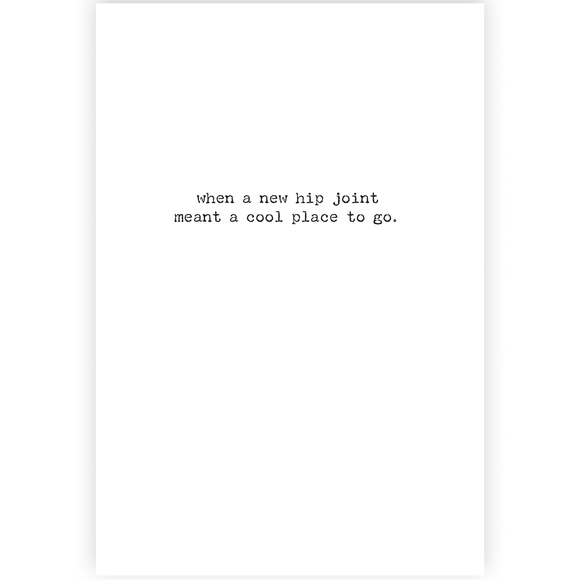 A greeting card from our Trash Talk By Annie Collection displaying a vintage black and white photograph complemented with a sassy age themed sentiment. Sassy greeting card features "Ahhh, The Good Old Days..." sentiment on the outside and "When A New Hip Joint Meant A Cool Place To Go." sentiment on the inside with space to add a personalized message. Our Ahhh The Good Old Days greeting card is a hilarious gift for birthdays or everyday moments. Proudly made in the USA.