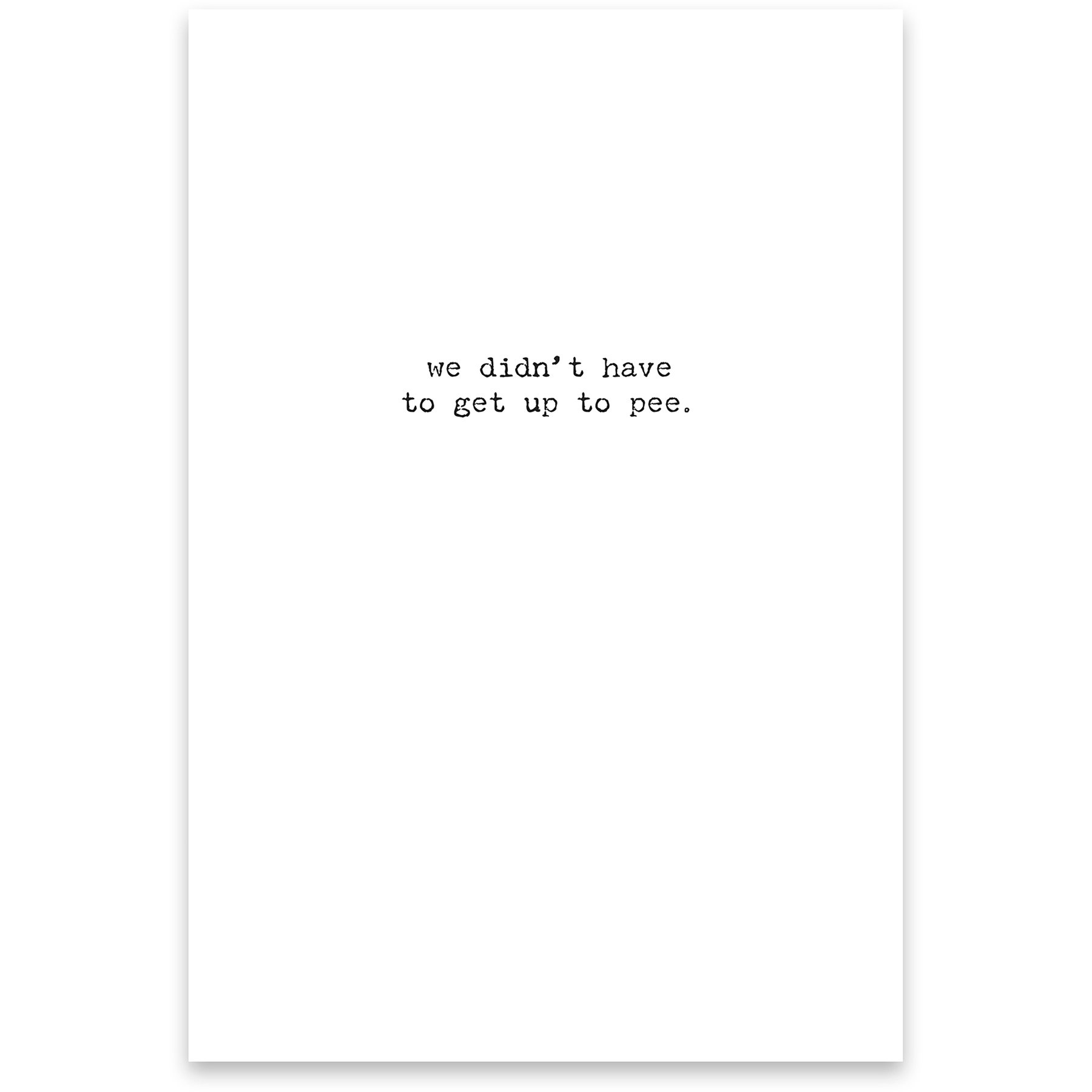 A humorous greeting card from our Trash Talk By Annie Collection displaying a vintage photograph with complementing sentiments. Card features "At Our Age, An 'All Nighter' means…" sentiment on the outside and "We Didn't Have To Get Up To Pee." sentiment on the inside with space to add a personalized message. Our All Nighter Means greeting card is a hilarious gifting option for everyday moments. Proudly made in the USA.