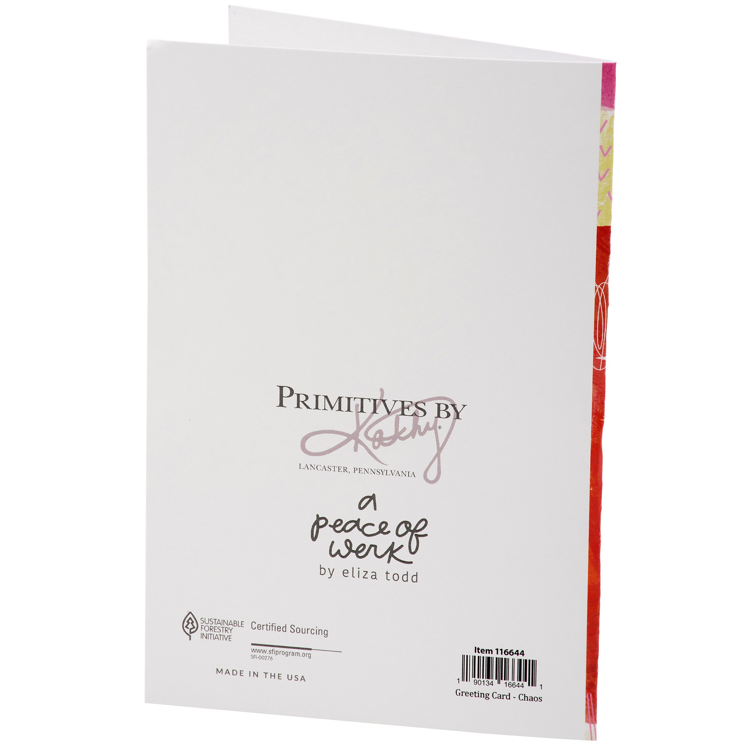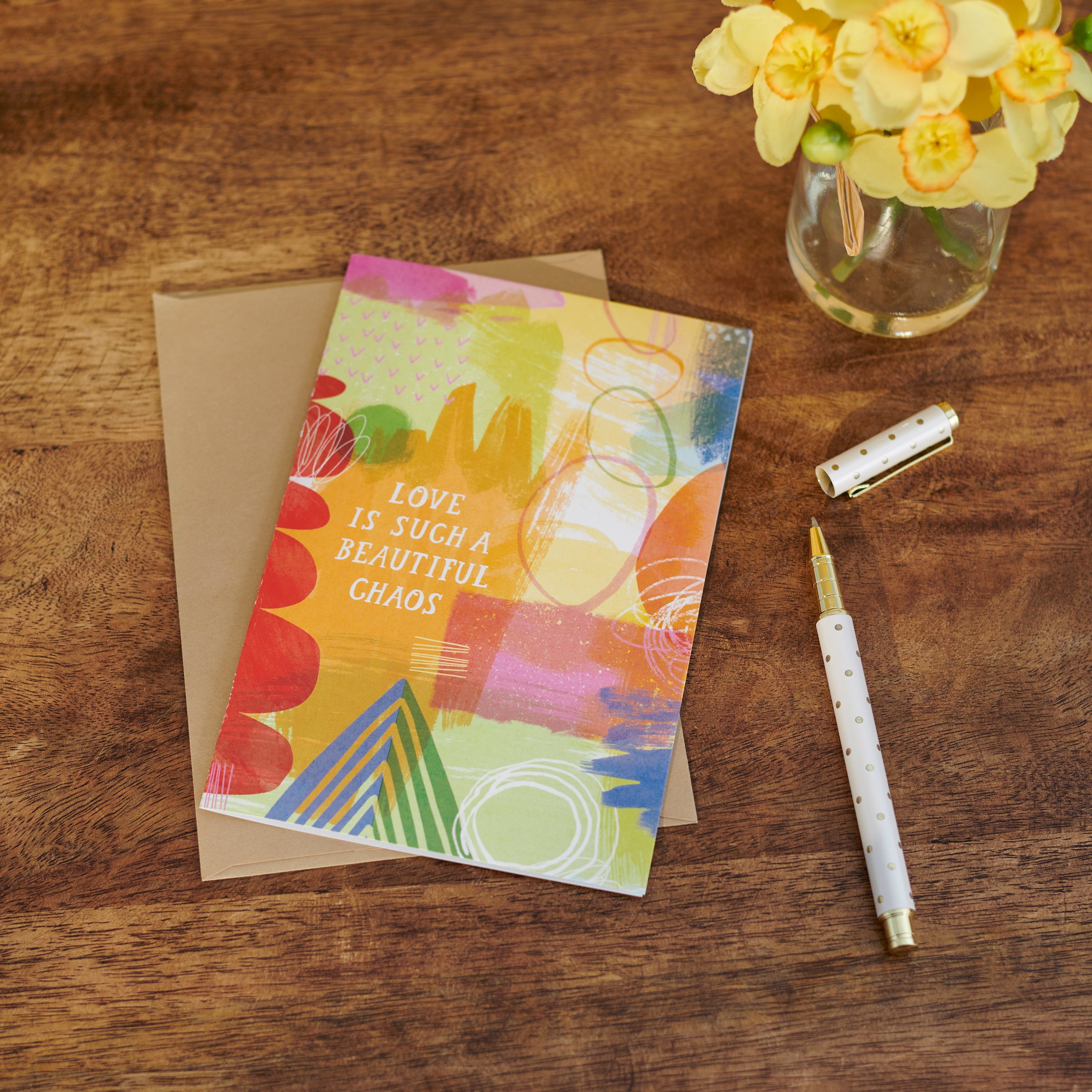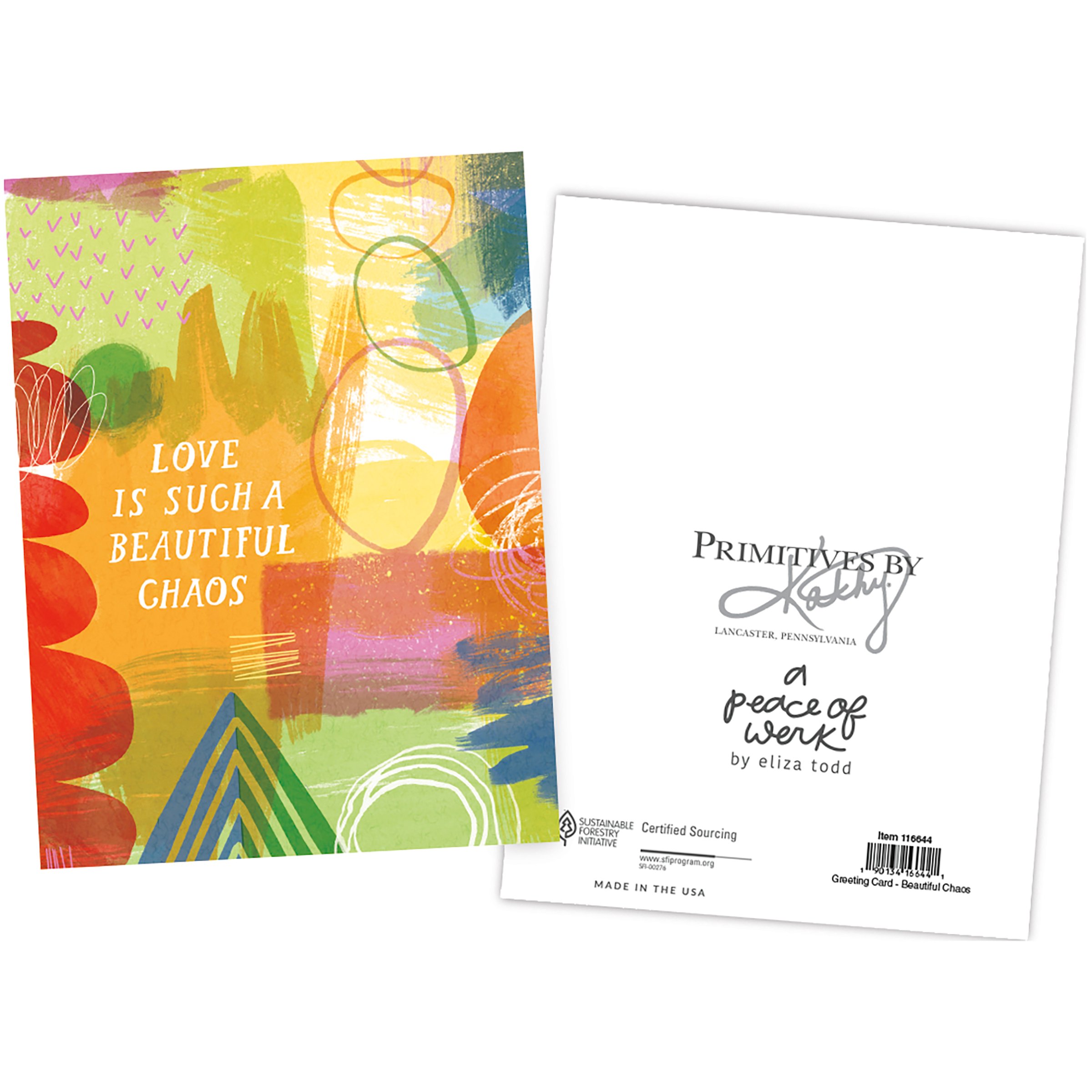 An inspirational greeting card from our Greeting Card Collection displaying a hand illustrated abstract design in a warm color palette with an uplifting sentiment that reads "Love Is Such A Beautiful Chaos" and blank space inside to create a personalized message. Each card includes a brown kraft paper envelope for the perfect finishing touch. Our Beautiful Chaos greeting card is a lovely gifting option for everyday moments. Proudly made in the USA.