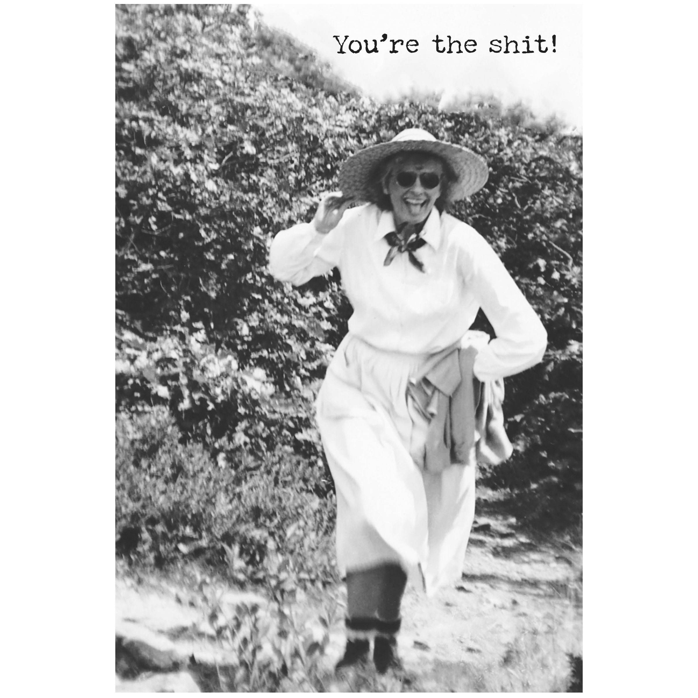 A greeting card from our Trash Talk By Annie Collection displaying a vintage black and white photograph complemented with a humorous sentiment. Greeting card features "You're The Shit!" sentiment on the outside and "I'm Not Sure How That Became A Compliment... But There You Go!" sentiment on the inside with space to add a personalized message. Our Compliment greeting card is a hilarious gifting option for everyday moments. Proudly made in the USA.