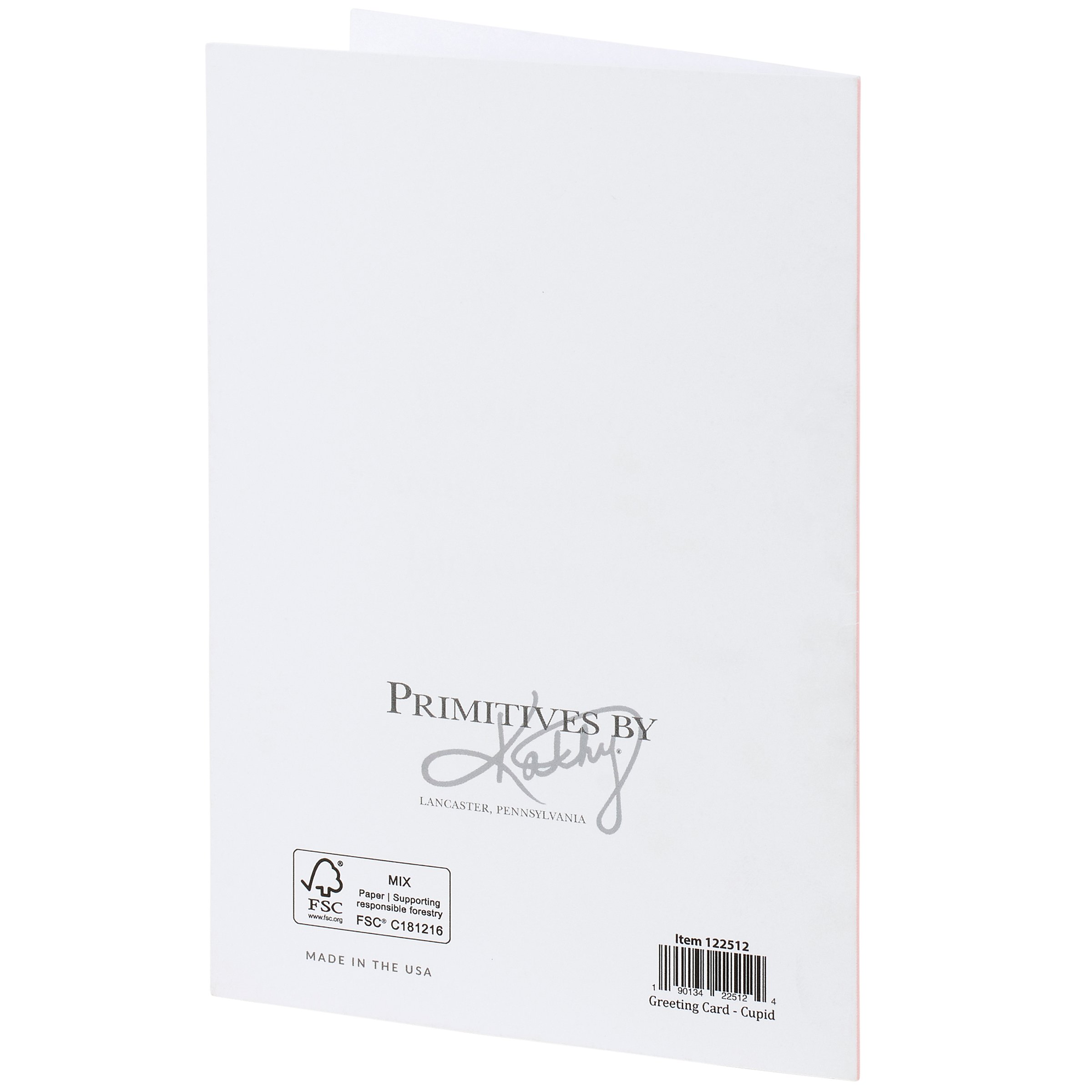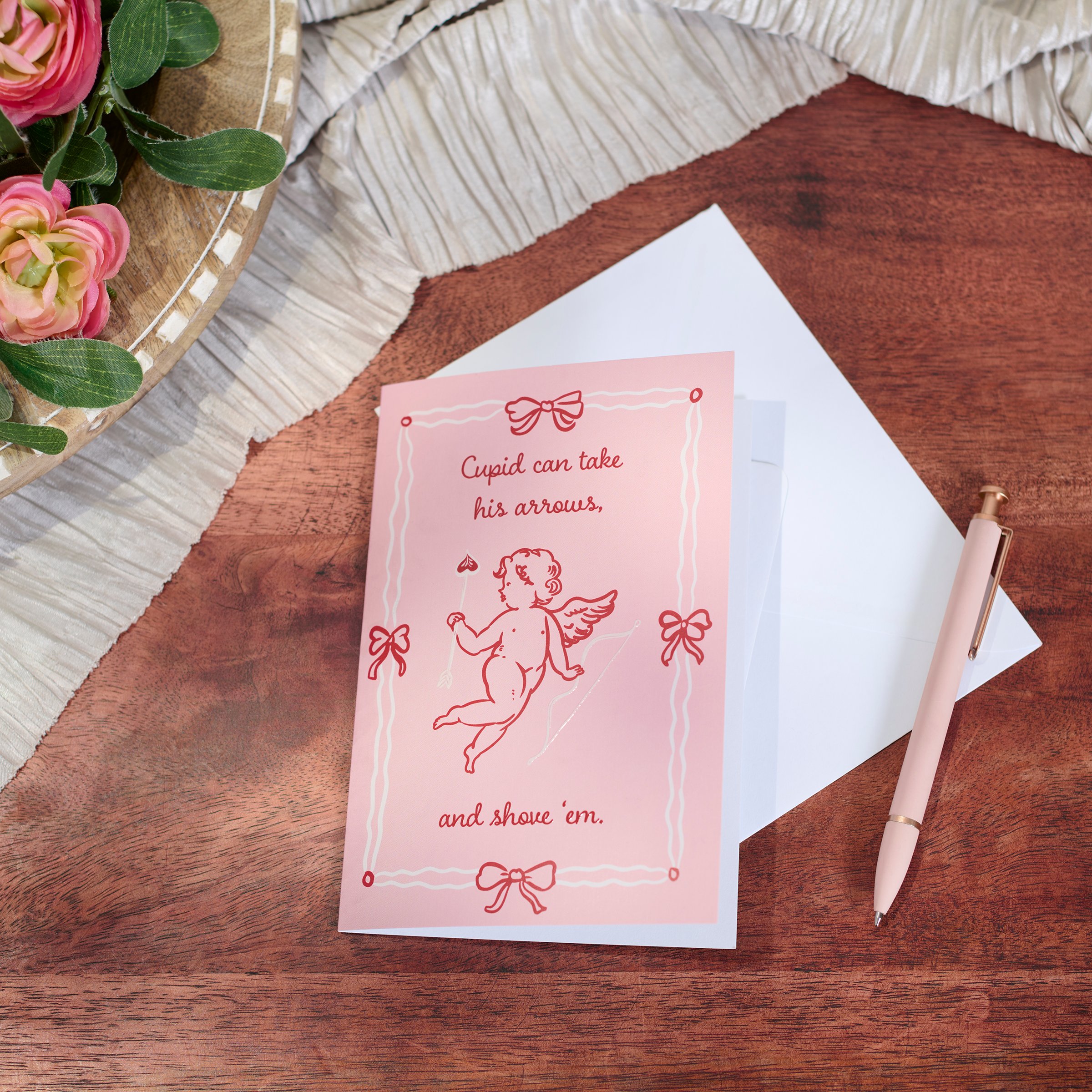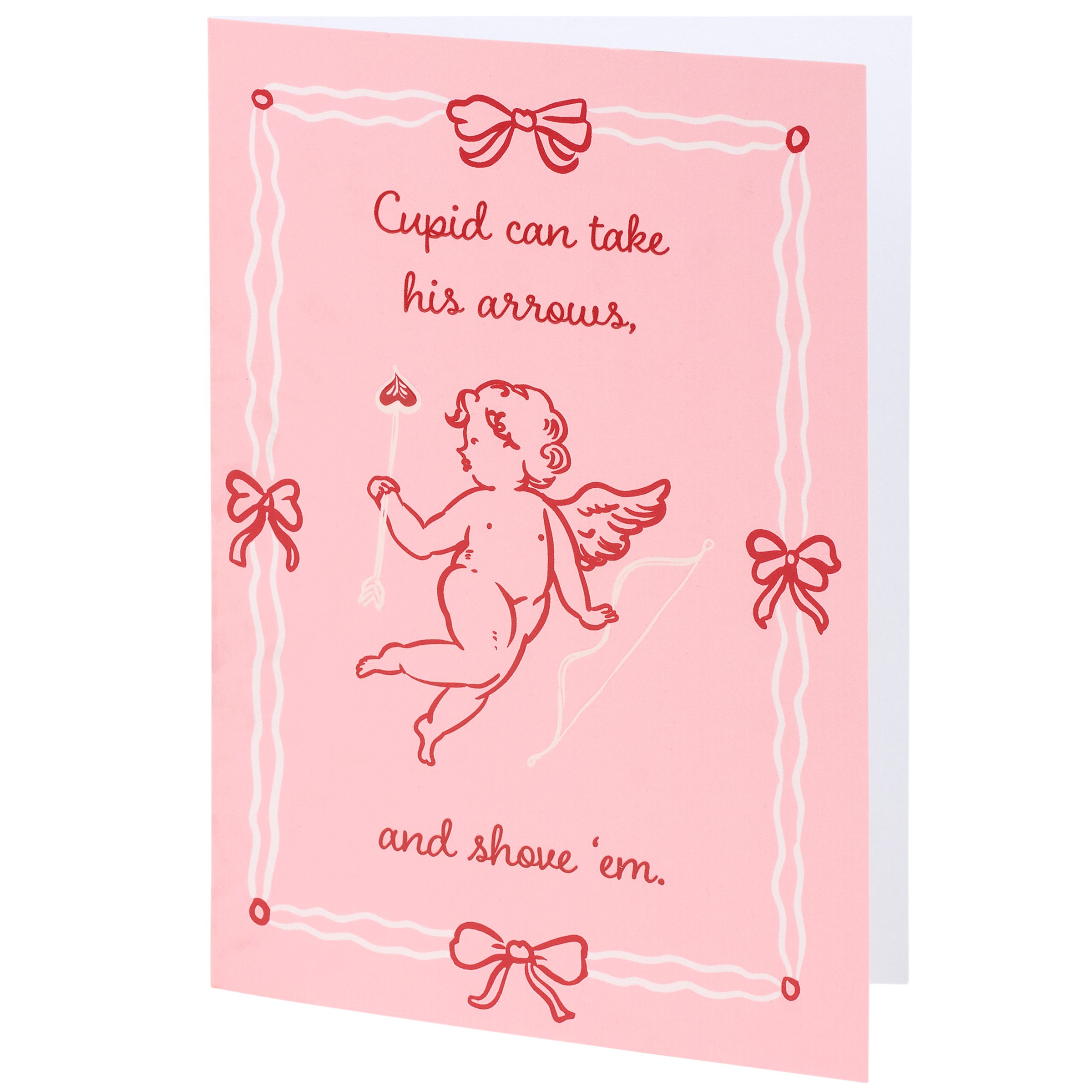 A greeting card from our Anti Valentine Collection featuring cupid inspired art and a sassy sentiment that offers a fun alternative to Valentine's Day gifting. Anti-valentine card displays art of cupid holding a bow and arrow in a hand illustrated style with a sarcastic love-themed sentiment that reads "Cupid Can Take His Arrows And Shove 'Em" and a "I'm Here If You Need Wine Or Chocolate!" sentiment on the inside of the card. Our Cupid greeting card features digitally embossed accents that add texture to the design for a premium feel. A sassy love themed gift that easily expresses anti-valentine sentiment while fitting in with Valentine's Day gifting. Proudly made in the USA.