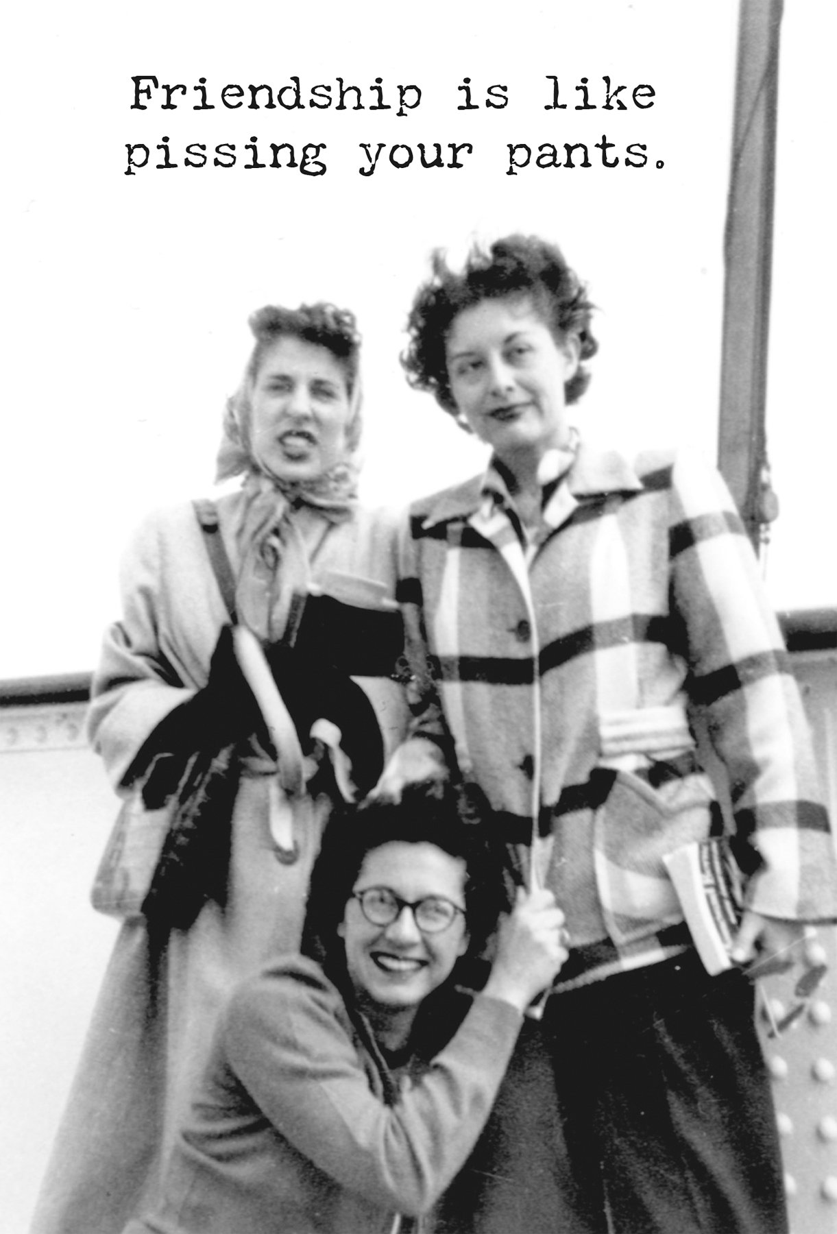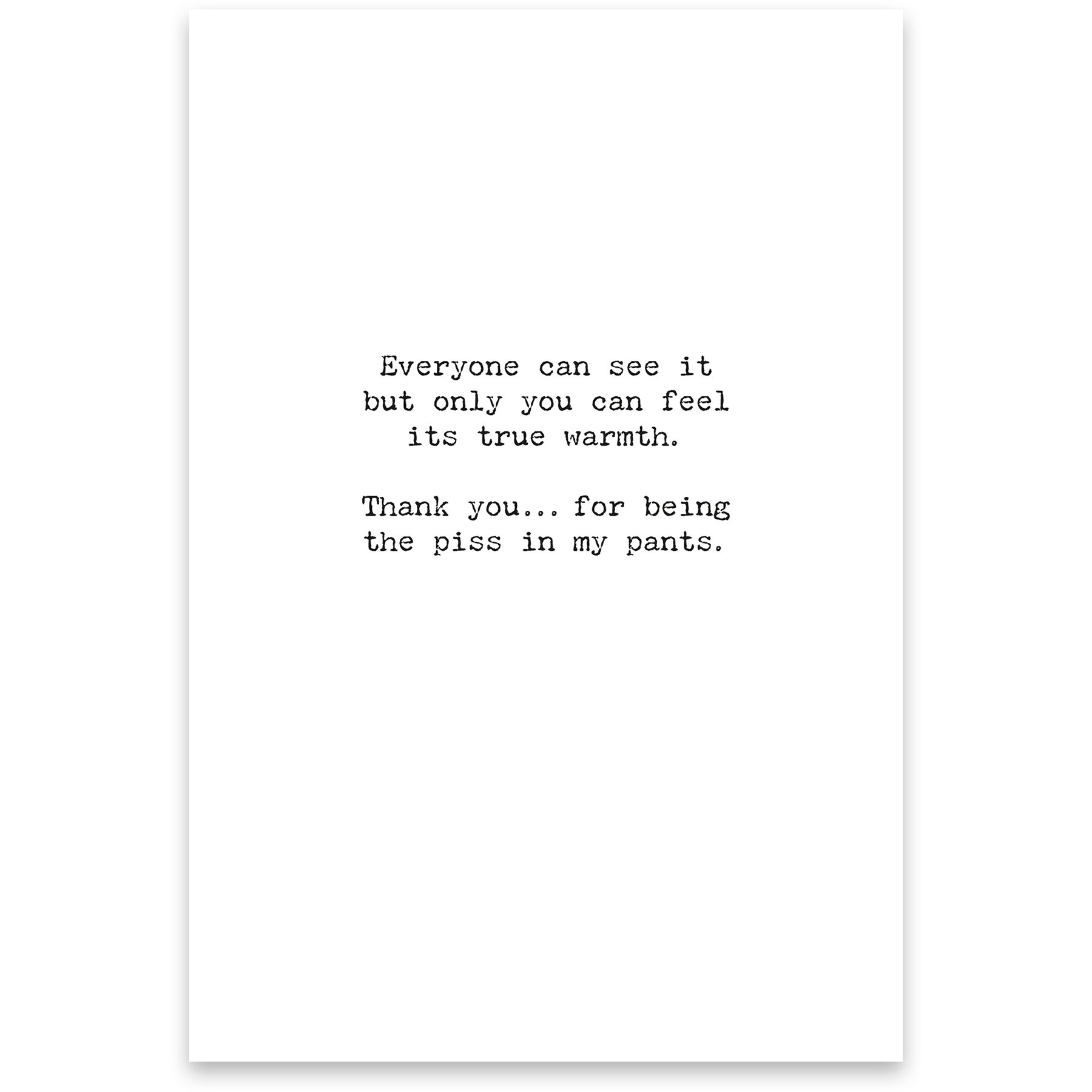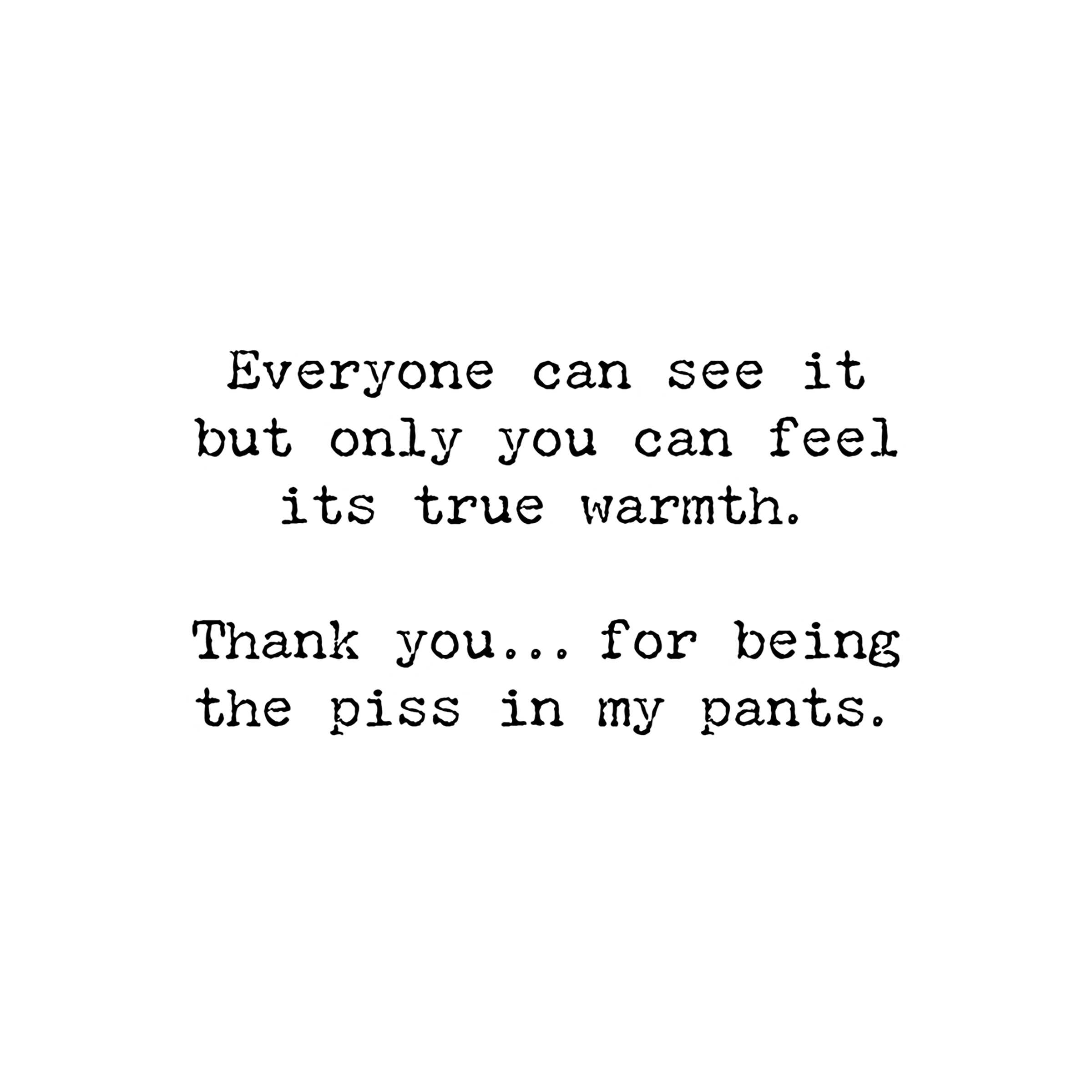 Made in the USA. Outside: Friendship is like pissing your pants. Inside: Everyone can see it but only you can feel it's true warmth. Thank you... For being the piss in my pants.