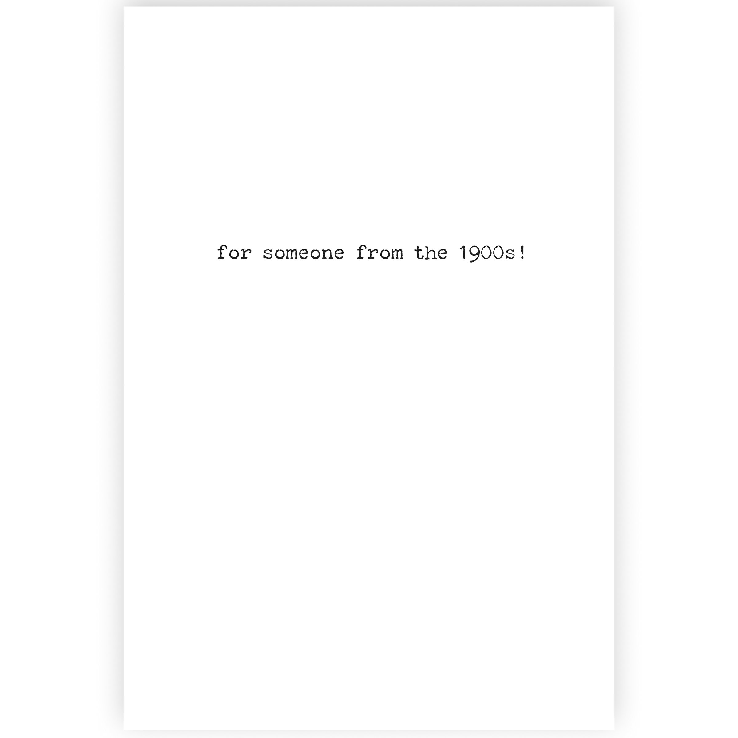 A greeting card from our Trash Talk By Annie Collection displaying a vintage black and white photograph complemented with a sassy age themed sentiment. Sassy greeting card features "You Look Pretty Good..." sentiment on the outside and "For Someone From The 1900s!" sentiment on the inside with space to add a personalized message. Our From The 1900s greeting card is a hilarious gift for birthdays or everyday moments. Proudly made in the USA.