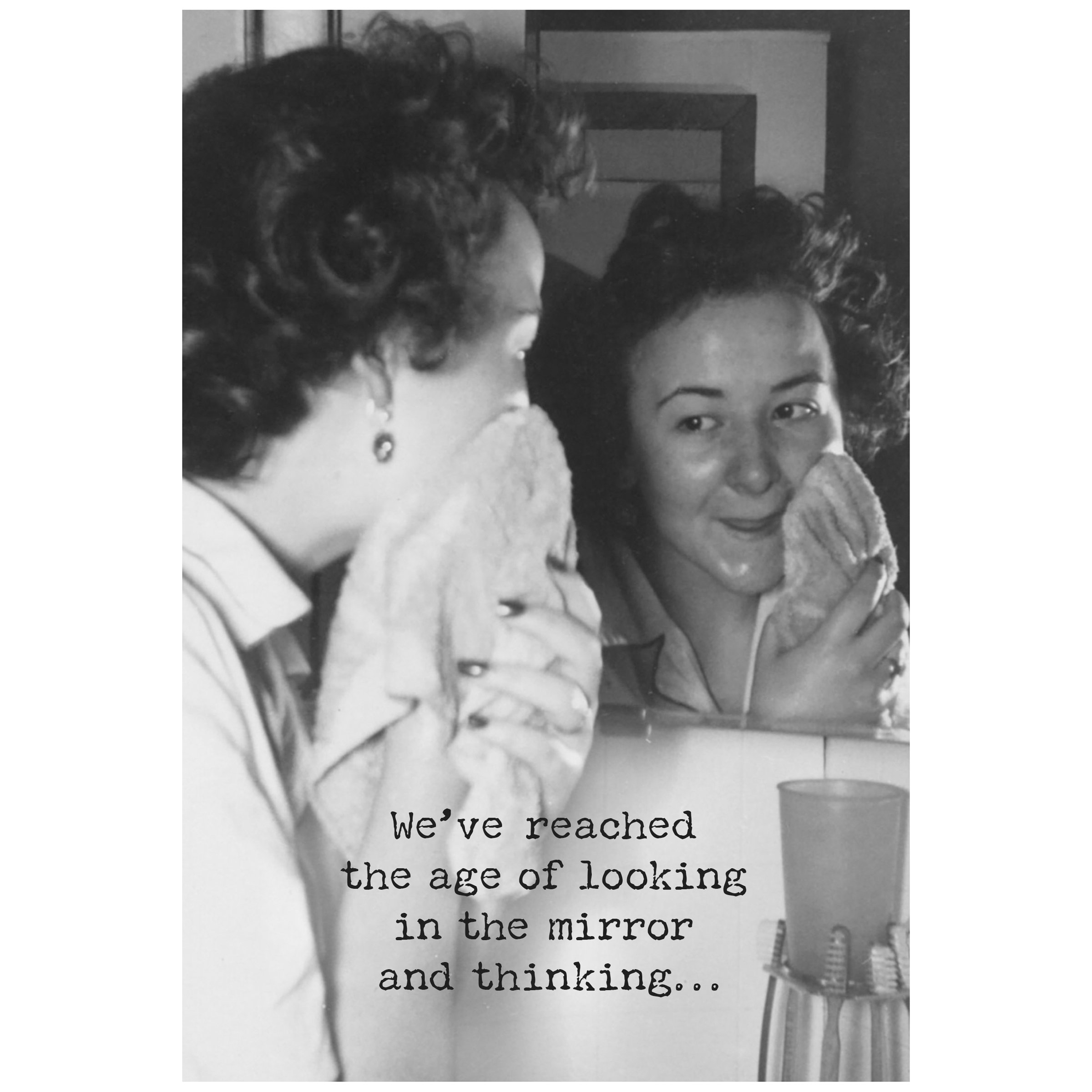 A greeting card from our Trash Talk By Annie Collection displaying a vintage black and white photograph complemented with a humorous age inspired sentiment. Greeting card features "We've Reached The Age Of Looking In The Mirror And Thinking..." sentiment on the outside and "That Can't Be Accurate." sentiment on the inside with space to add a personalized message. Our Looking In The Mirror greeting card is a hilarious gifting option for birthdays or everyday moments. Proudly made in the USA.
