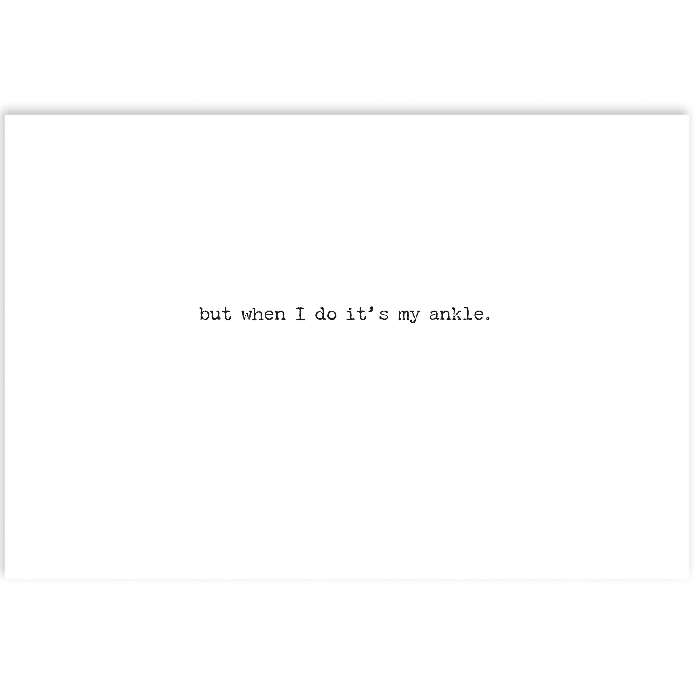 A greeting card from our Trash Talk By Annie Collection displaying a vintage black and white photograph complemented with a humorous sentiment. Greeting card features "I Don't Always Roll A Joint..." sentiment on the outside and "But When I Do It's My Ankle." sentiment on the inside with space to add a personalized message. Our My Ankle greeting card is a hilarious gifting option for everyday moments. Proudly made in the USA.