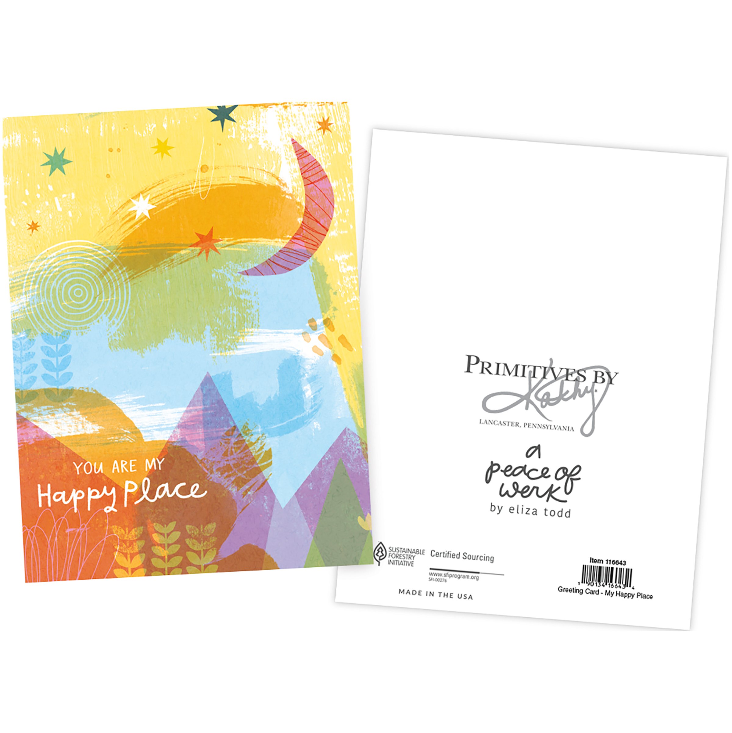 An inspirational greeting card from our Greeting Card Collection displaying a hand illustrated abstract design in a warm color palette with a heartwarming sentiment that reads "You Are My Happy Place" and blank space inside to create a personalized message. Each card includes a brown kraft paper envelope for the perfect finishing touch. Our My Happy Place greeting card is a lovely gifting option for everyday moments. Proudly made in the USA.