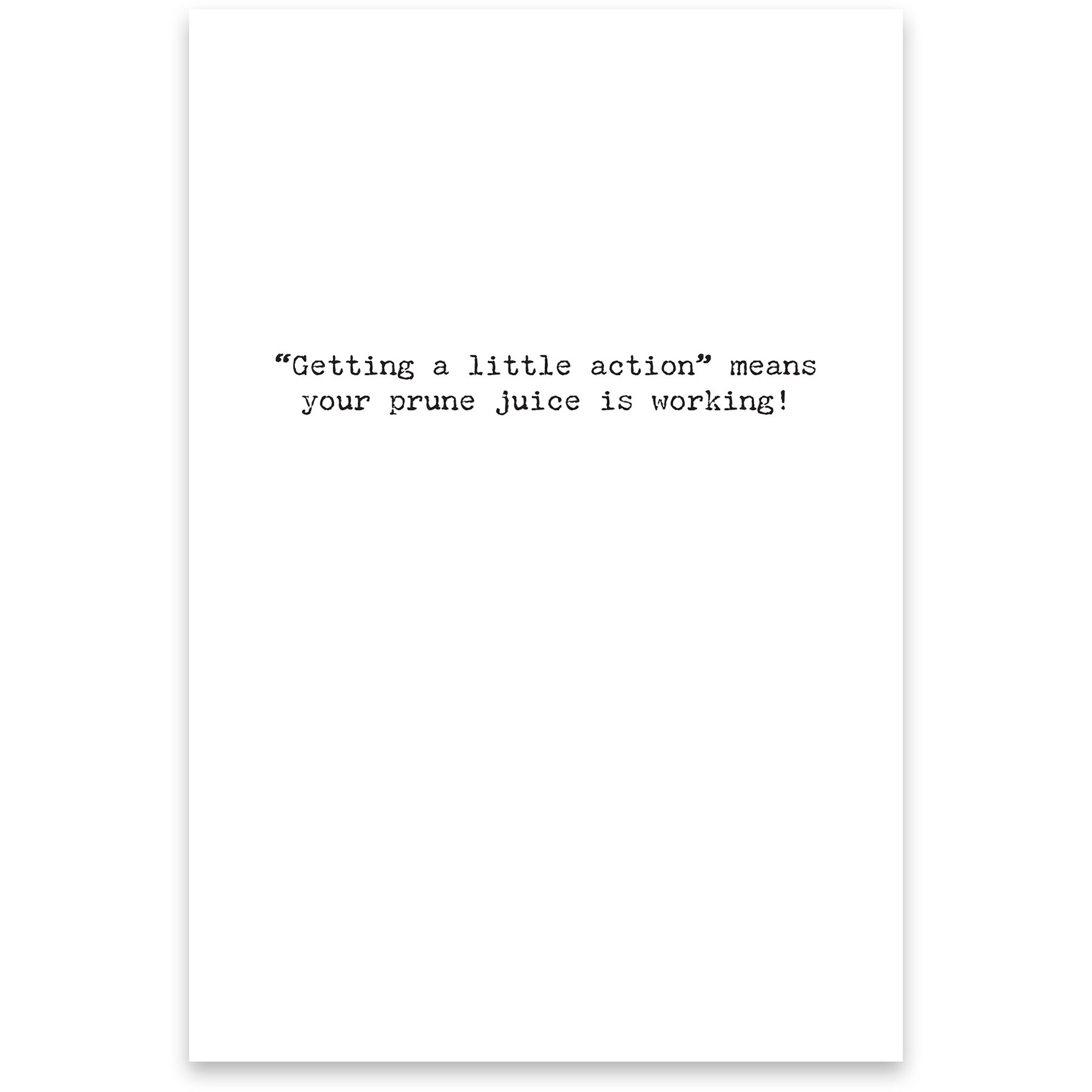A humorous greeting card lending a vintage photograph to coordinate with its outside "You Know You're Getting Old When..." sentiment and inside "'Getting A Little Action' Means Your Prune Juice Is Working" sentiment. Made in the USA.