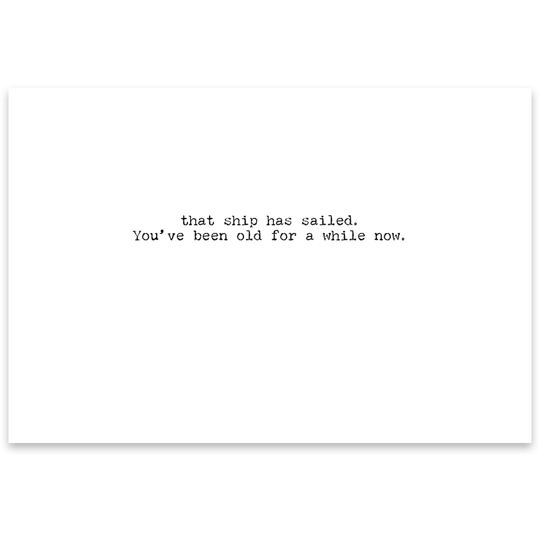 A humorous greeting card from our Trash Talk by Annie Collection features a vintage photograph with "Relax, You're Not Getting Old…" sentiment on the outside, and "That Ship Has Sailed. You've Been Old For Awhile Now…" sentiment on the inside. Our Relax greeting card is made in the USA.