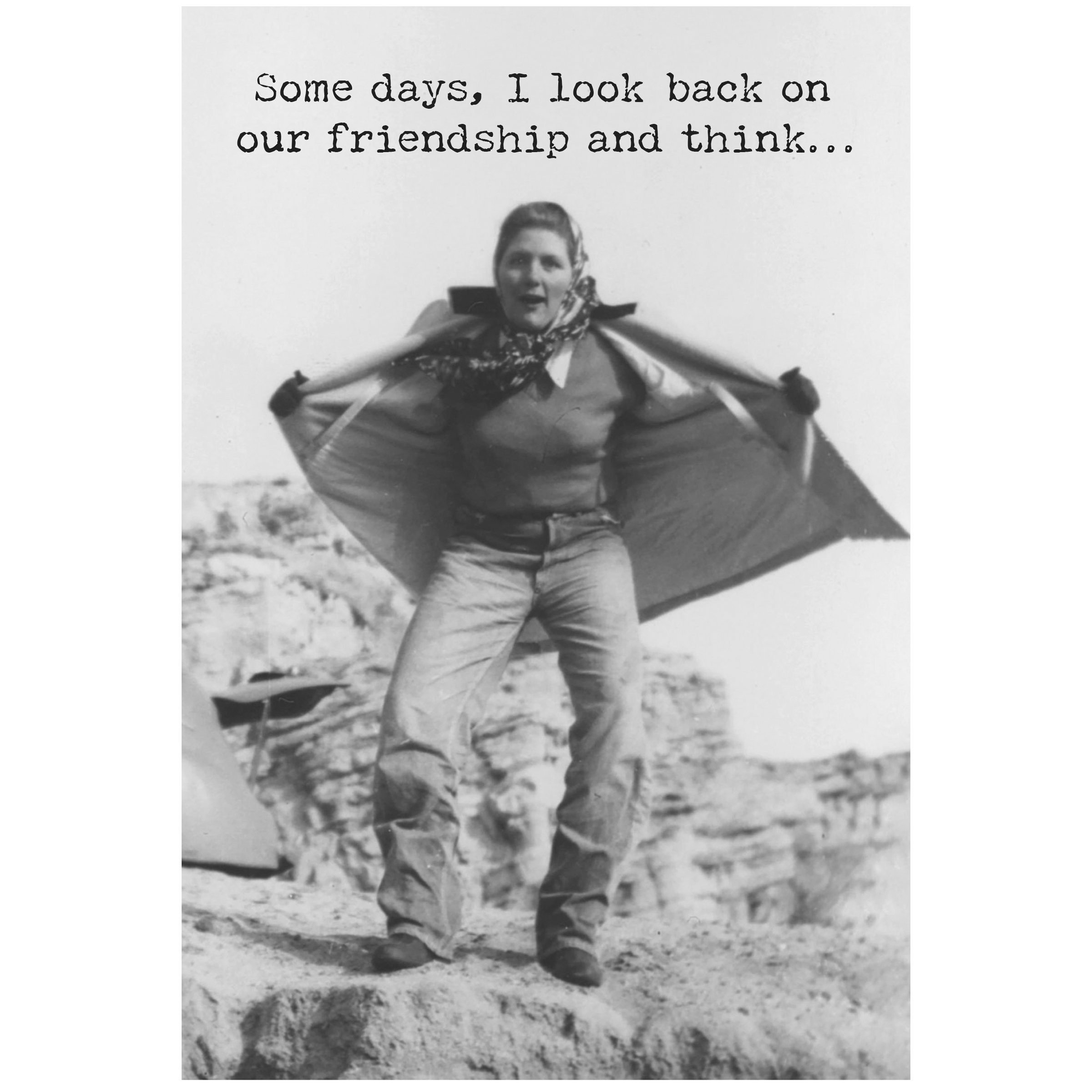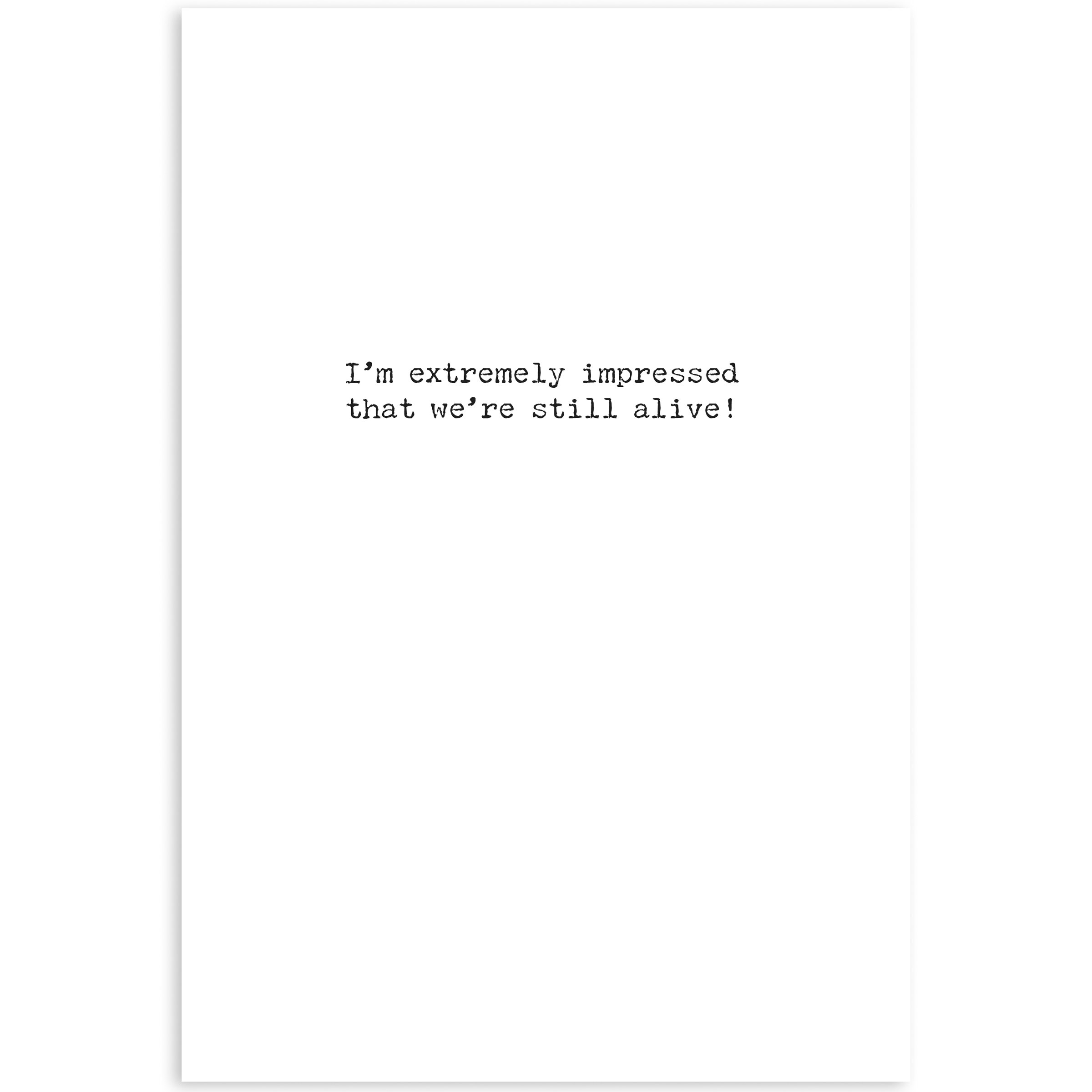 A greeting card from our Trash Talk By Annie Collection displaying a fun vintage black and white photograph complemented with a humorous friendship inspired sentiment. Greeting card features "Some Days, I Look Back On Our Friendship And Think..." sentiment on the outside and "I'm Extremely Impressed That We're Still Alive!" sentiment on the inside with space to add a personalized message. Our Still Alive greeting card is a hilarious gifting option for everyday moments. Proudly made in the USA.