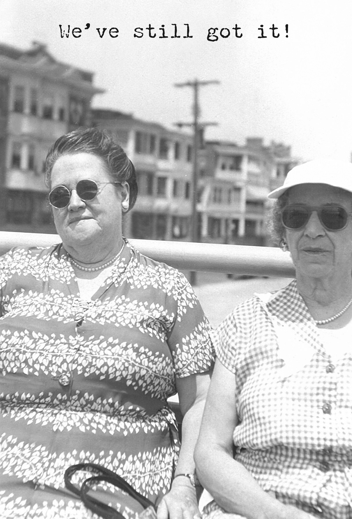 A humorous greeting card lending a vintage photograph to coordinate with its outside "We've Still Got It!" sentiment and inside "But Nobody Wants To See It! Happy Birthday!" sentiment. Made in the USA.