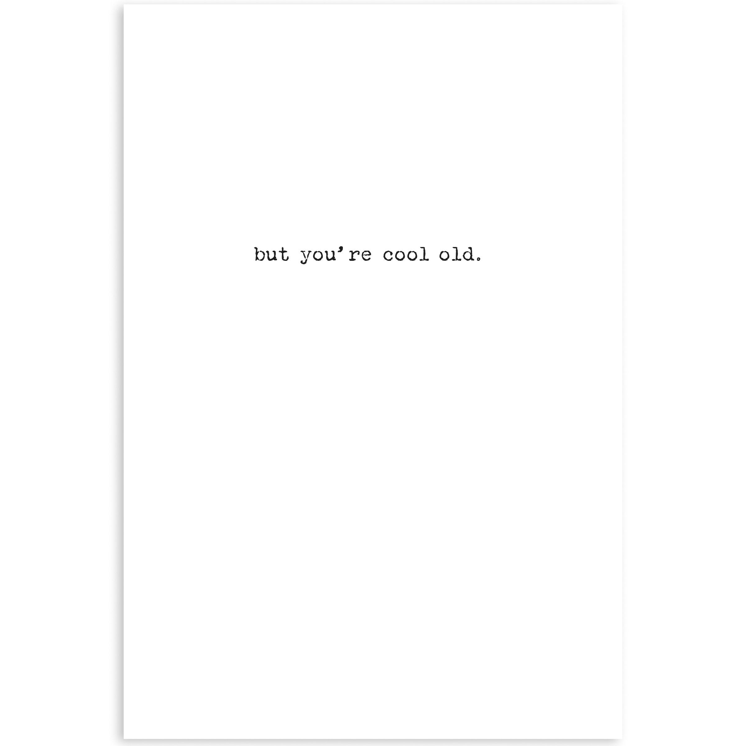 A greeting card from our Trash Talk By Annie Collection displaying a vintage black and white photograph complemented with a humorous age inspired sentiment. Greeting card features "Yes, You're Old..." sentiment on the outside and "But You're Cool Old." sentiment on the inside with space to add a personalized message. Our Yes You're Old greeting card is a hilarious gifting option for birthdays or everyday moments. Proudly made in the USA.