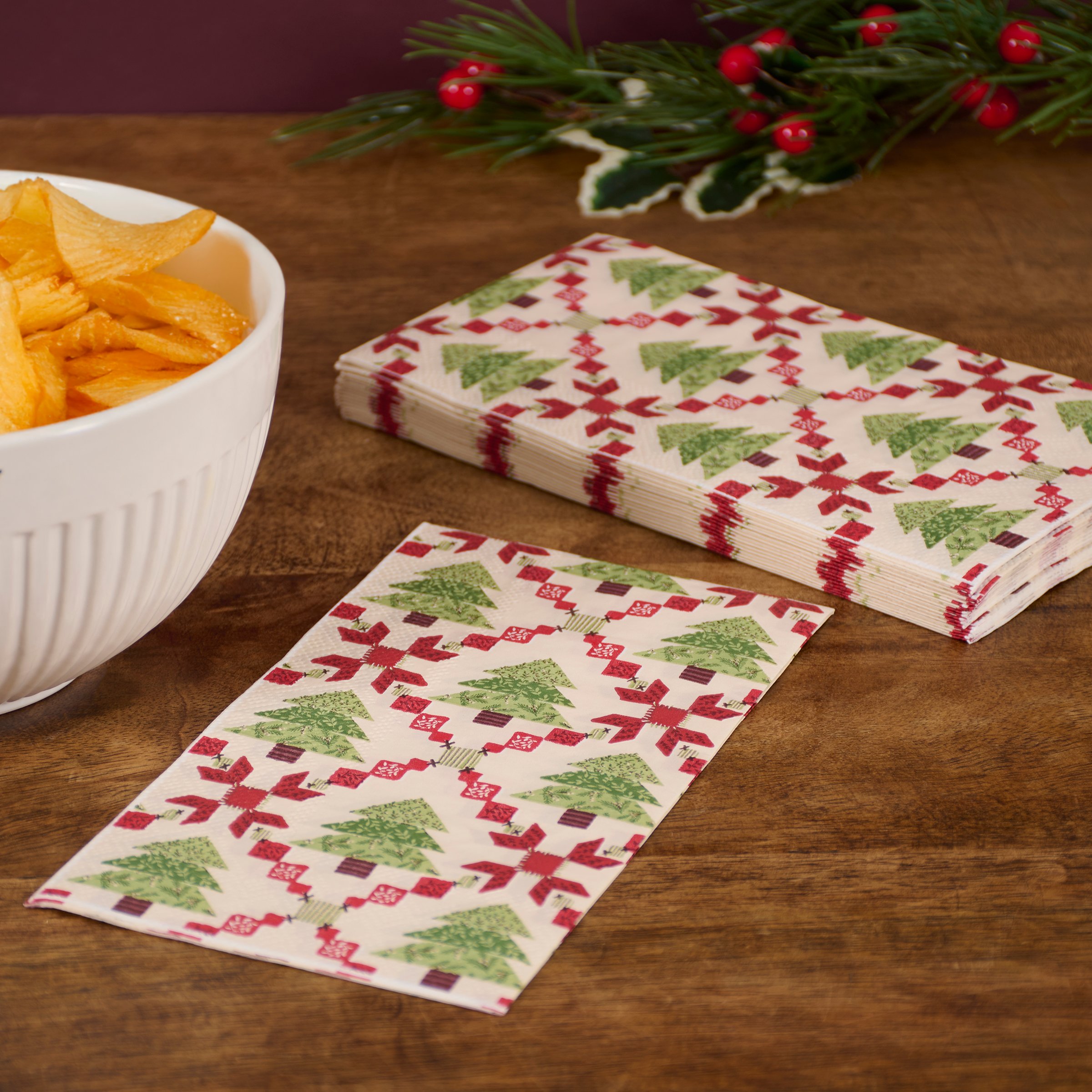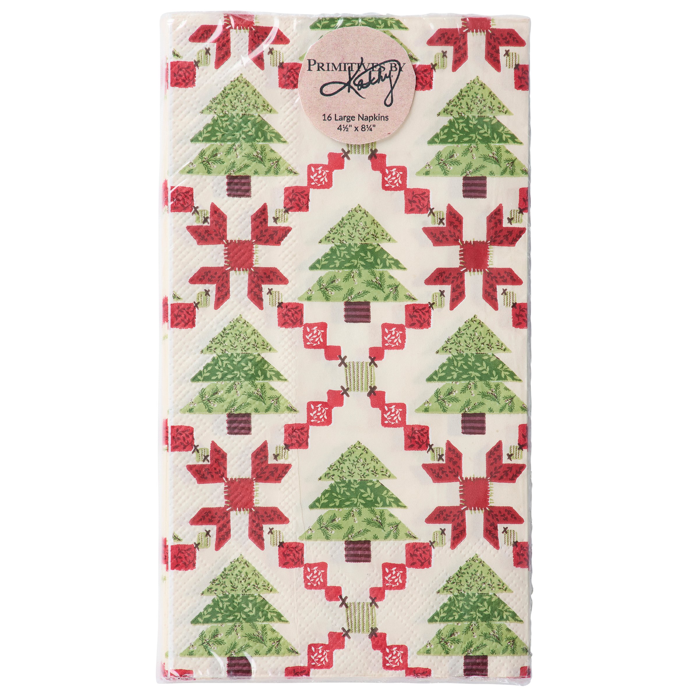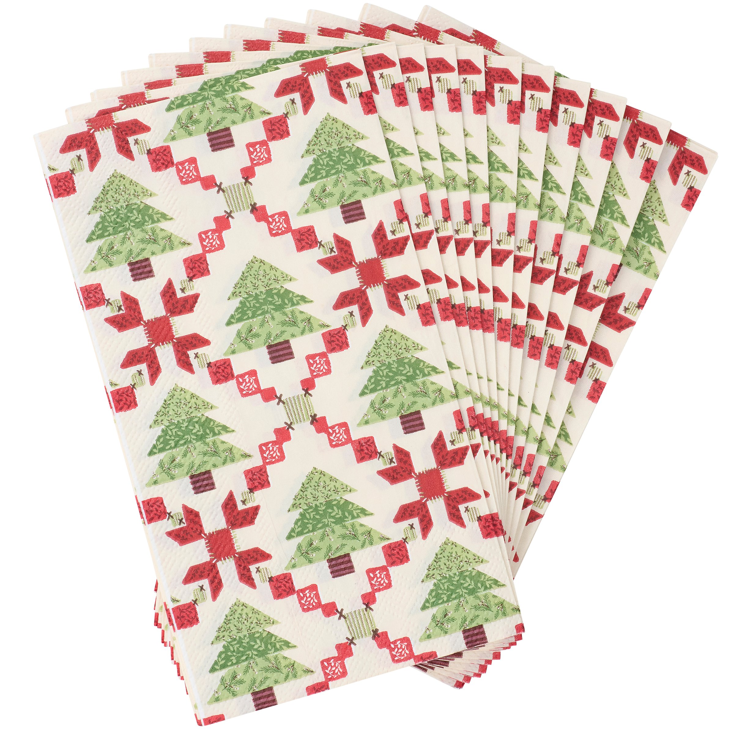 Perfect for customizing place settings and making clean-up a breeze, this seasonal paper napkin from our Craft Christmas Collection features a craft inspired Christmas tree quilt design replicated from original art hand painted in a unique watercolor style. Our Tree Quilt guest napkin measures 4.25 inches by 8 inches and comes shrink-wrapped in a set of 16 napkins. A craft themed Christmas tabletop accessory great for seasonal gatherings.