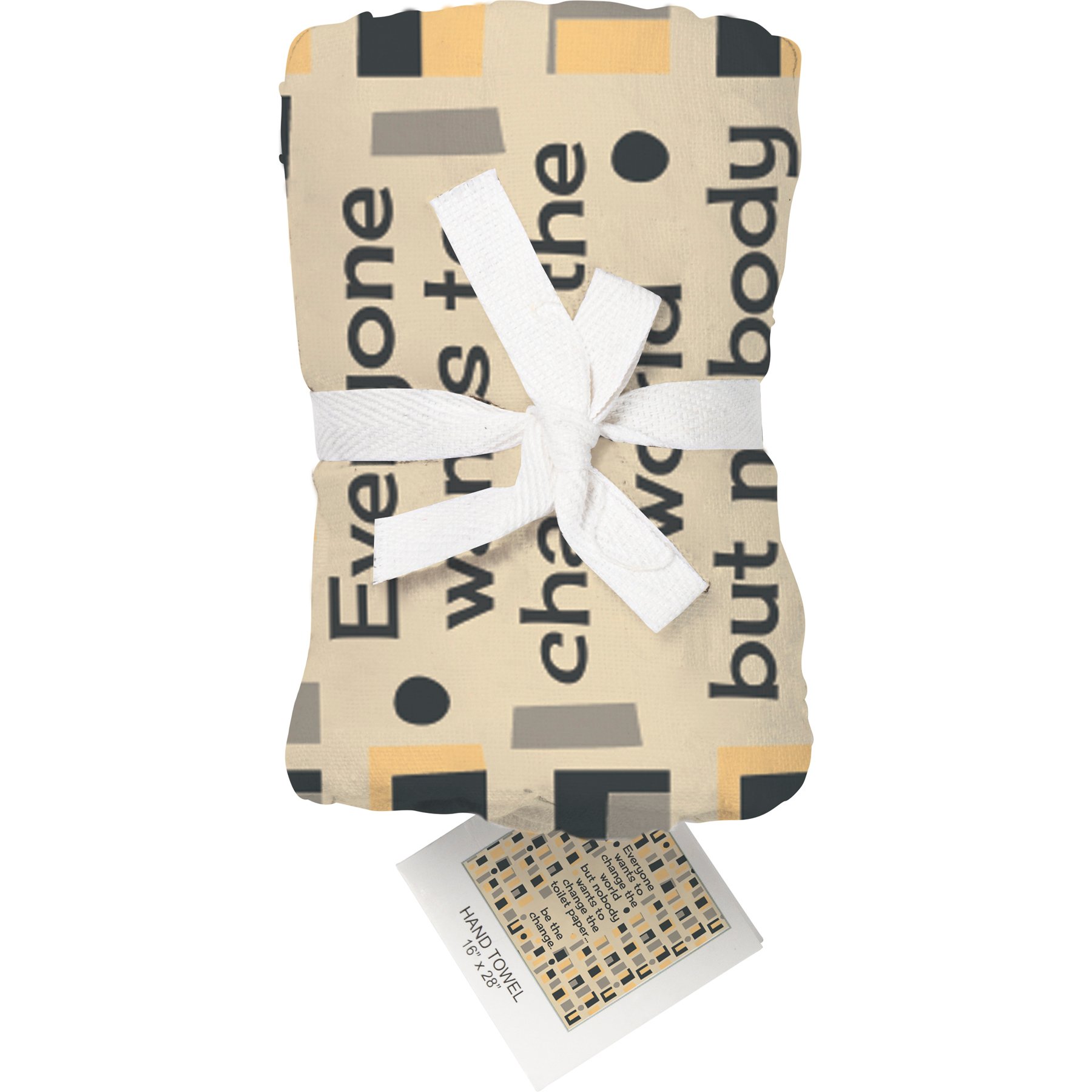A cotton hand towel featuring an "Everyone Wants To Change The World But Nobody Wants To Change The Toilet Paper…Be The Change." sentiment with an all-over retro-inspired pattern. Includes absorbent terry bottom layer. Machine-washable.