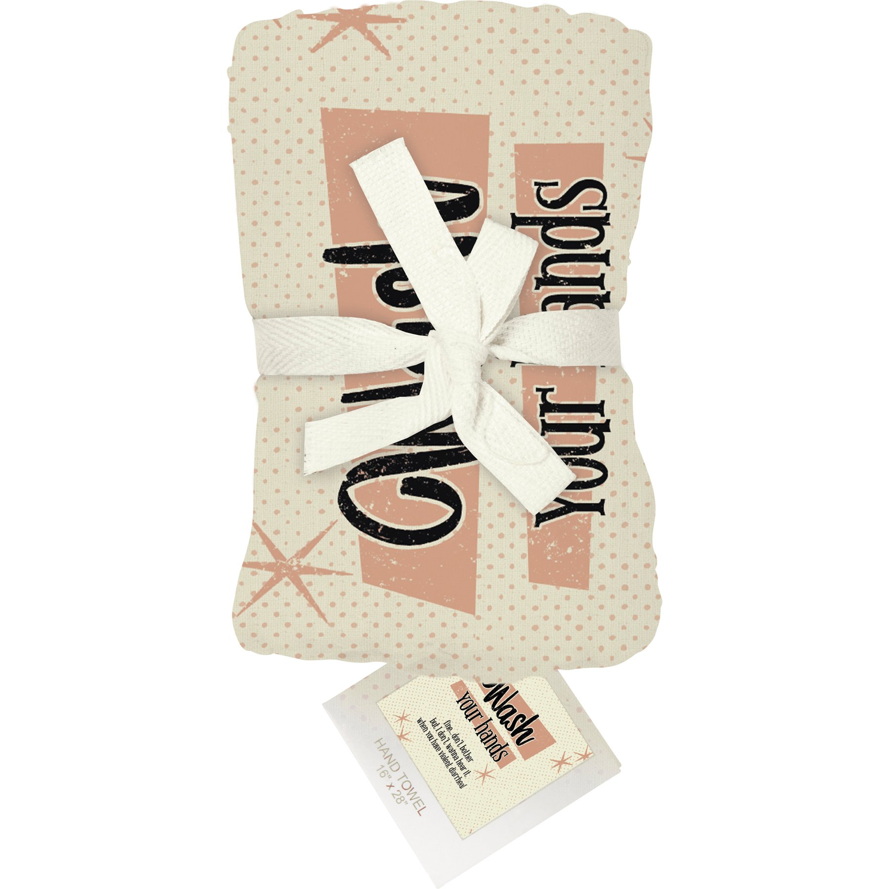 A hand towel featuring retro-inspired designs and "Wash Your Hands Fine...Don't Bother But I Don't Wanna Hear It When You Have Violent Diarrhea!" sentiment. Two-ply design includes soft cotton top layer with extra absorbent terry bottom layer. Includes stitched loop for easy hanging. Towel comes rolled and wrapped with cotton tape and features a hangtag displaying the full design. Machine-washable.