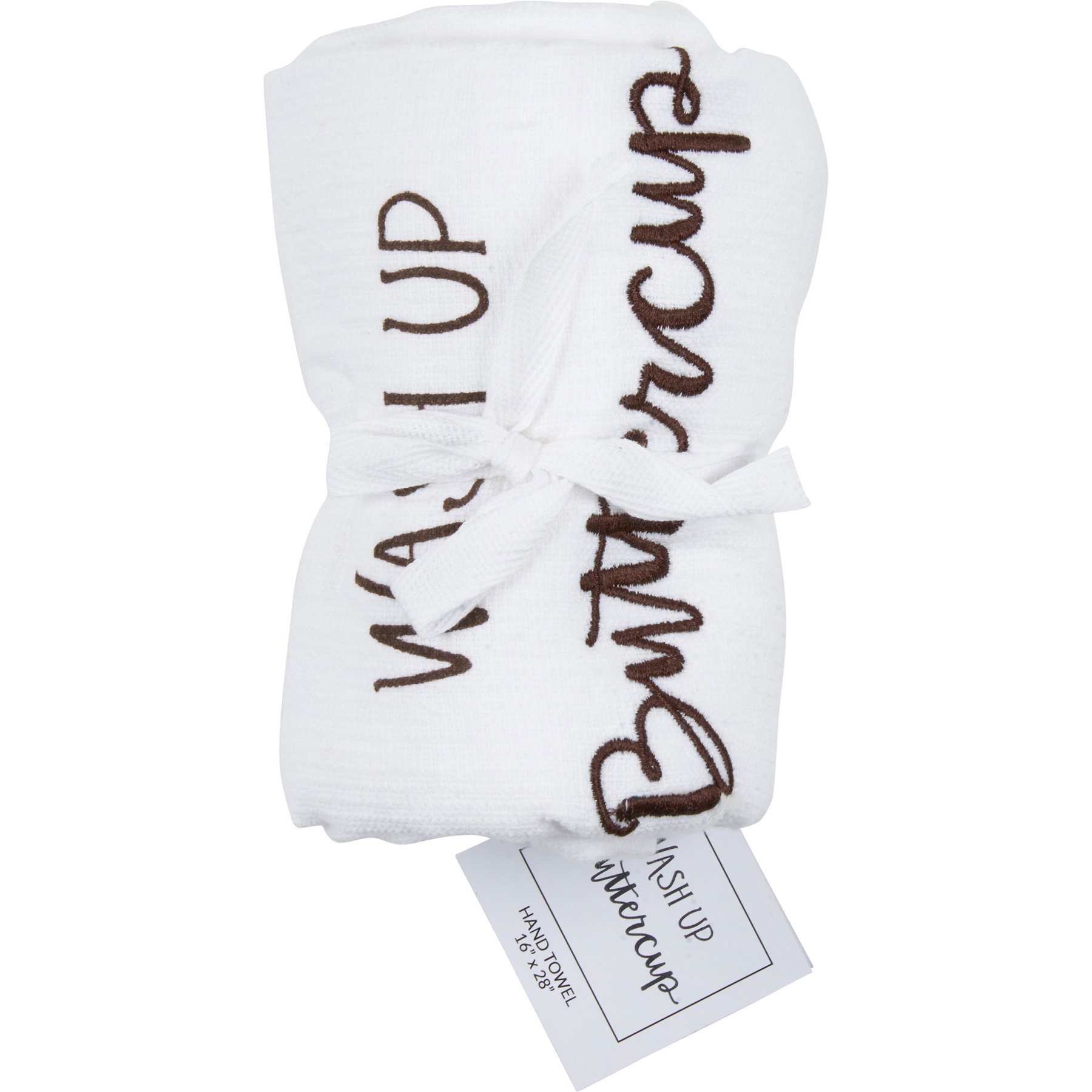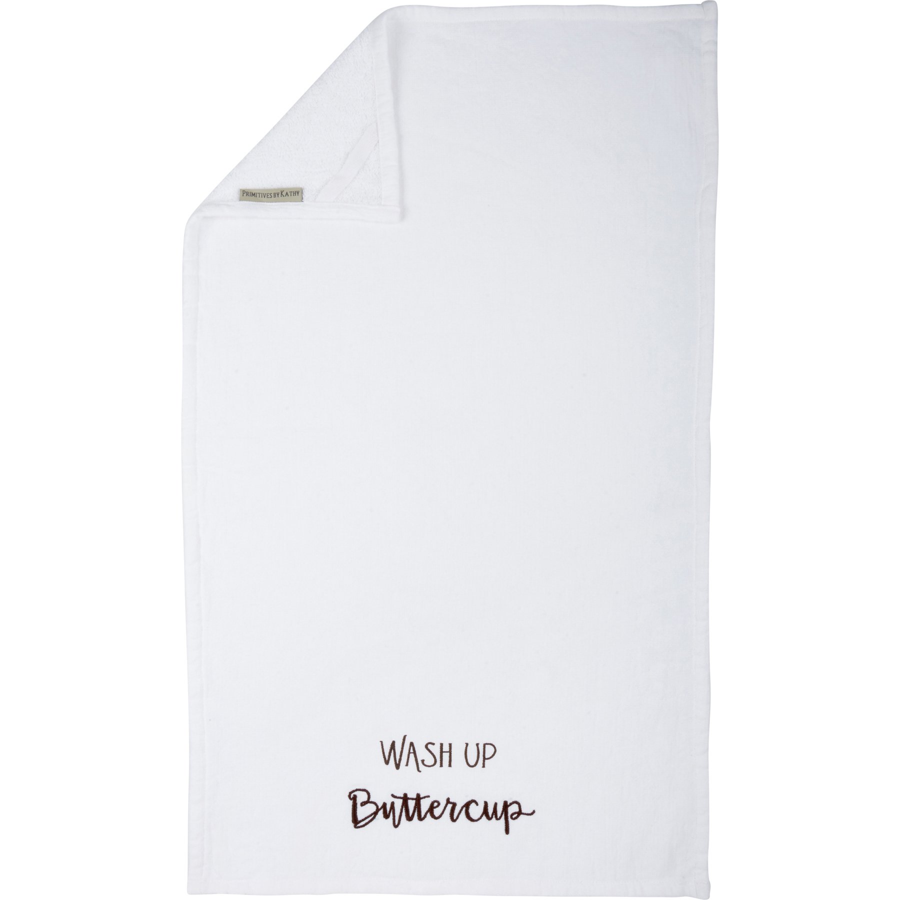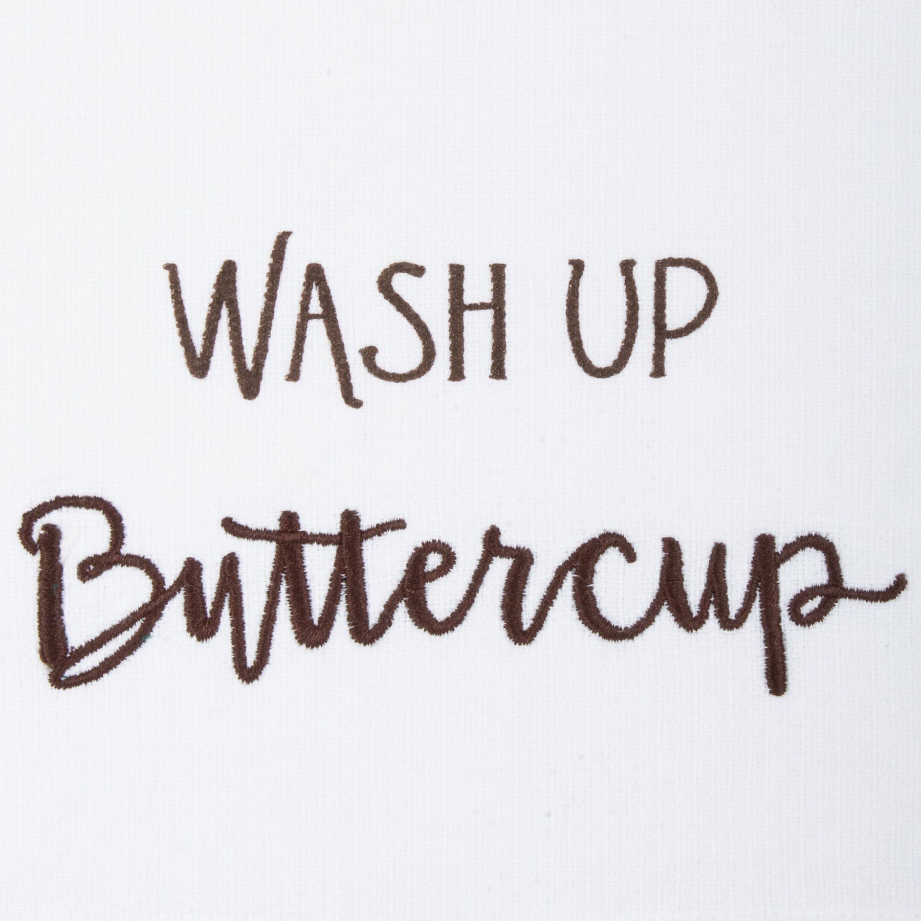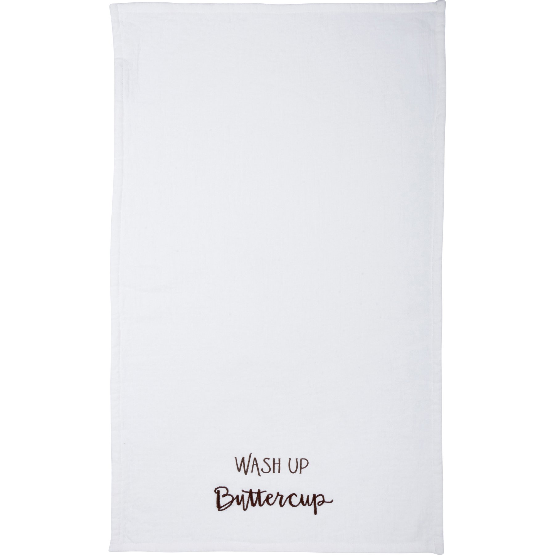 A white cotton hand towel from our Room By Room Collection displaying a humorous sentiment that reads "Wash Up Buttercup" fully embroidered for textured detail. Towel features absorbent terrycloth layer on the back with cotton tape loop for easy hanging. Our Wash Up Buttercup hand towel comes rolled and wrapped with cotton tape including hangtag displaying full design. Machine-washable for convenient cleaning. A fun everyday home accent perfect for any bathroom.
