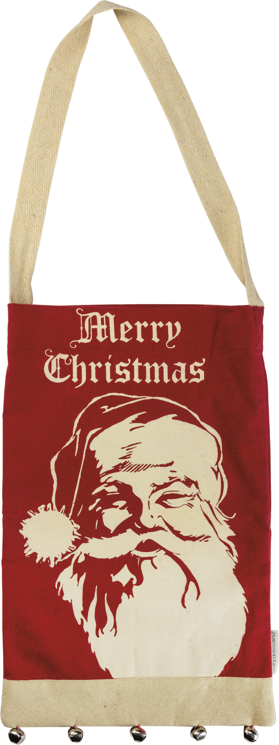 A vintage-inspired hanging cotton bag featuring a "Merry Christmas" sentiment, Santa design, and bottom bell trim details. Contains a top fabric loop for easy hanging.