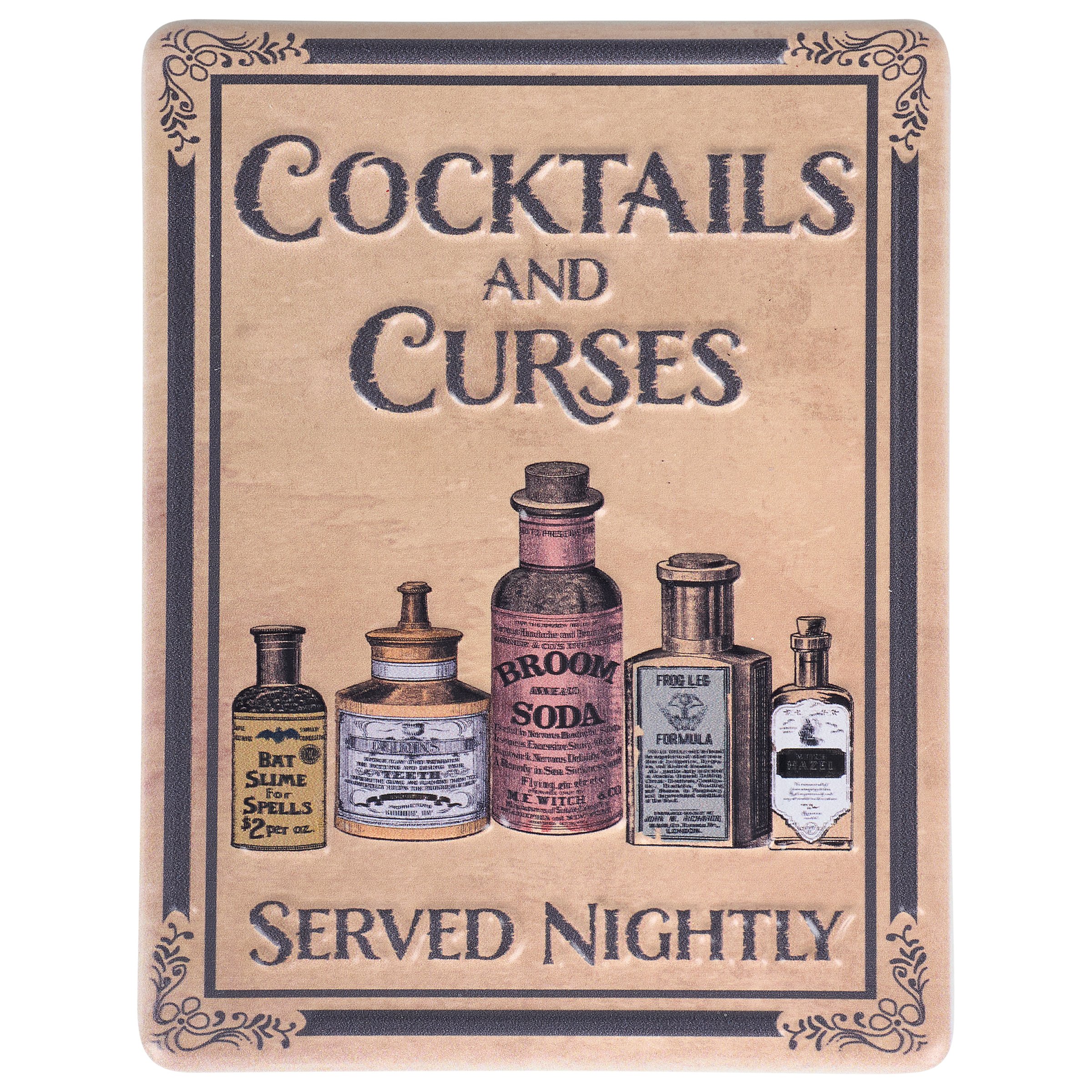 A metal wall décor piece from our Halloween Collection featuring a fun witch inspired design displaying rustic art of potion bottles with a sentiment that reads "Cocktails And Curses - Served Nightly." Rustic witch sign features embossed and debossed details for added dimension. Our Cocktails And Curses hanging décor is ready to hang via the attached sawtooth hangers on the back. A rustic Halloween home accent perfect for seasonal displays or for everyday witch themed decor.