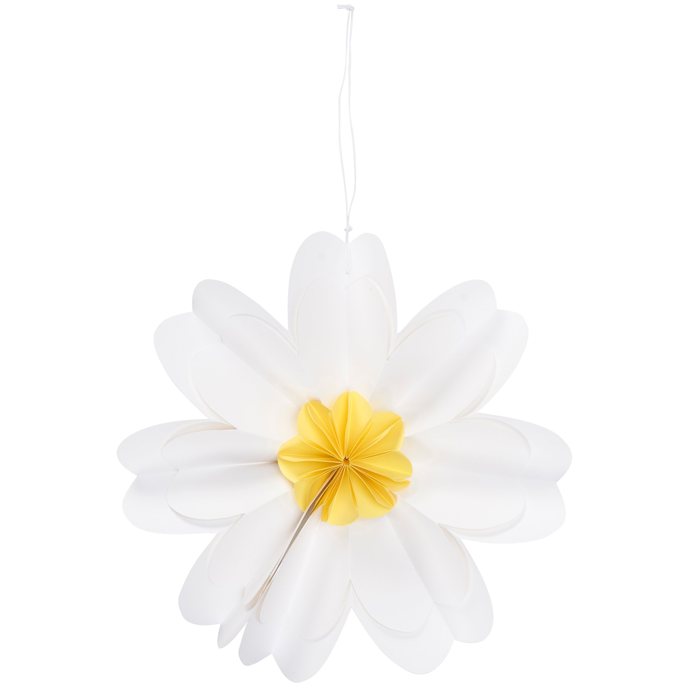 A hanging décor piece from our Garden Collection displaying a large daisy in a folded paper design. Our Paper Daisy hanging décor is easy to display using the attached string hanger. To display, unfold and attach ends via magnetic closure. Paper daisy folds up flat when not in use for easy storage. A charming daisy-themed home accent perfect for any room or for event decorations.