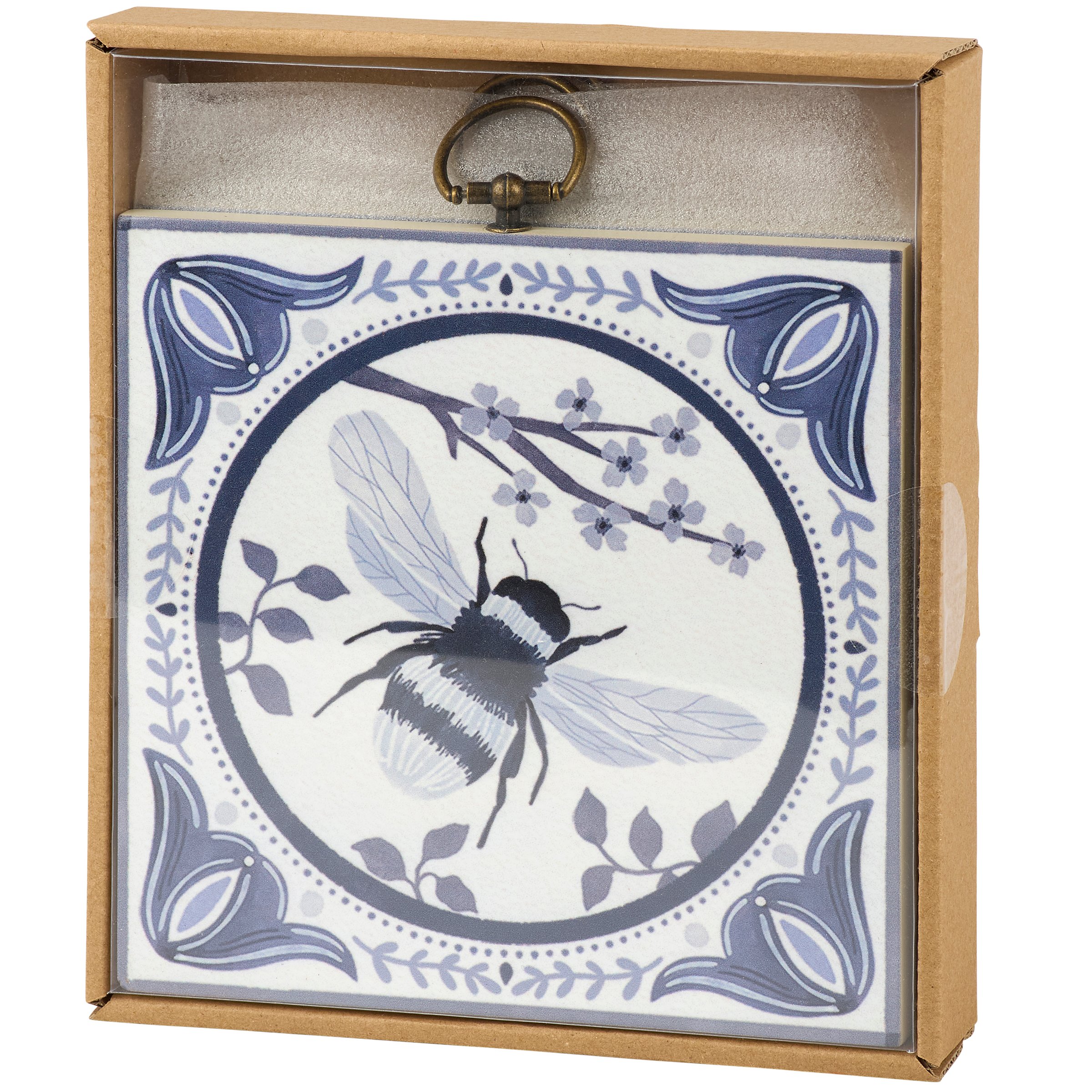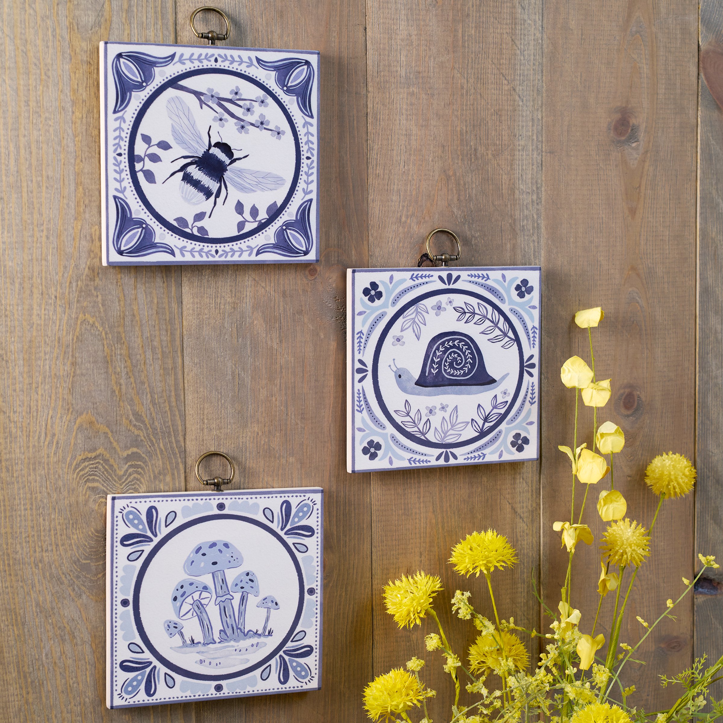 A set of wooden hanging décor pieces from our Home Collection displaying three tile inspired designs featuring various nature scenes in a calming indigo color palette. Each tile design features individual nature scenes replicated from original hand illustrated art. Our Indigo Tile hanging décor set is easy to hang for display via attached antique style hangers. Hanging decor set is packaged together in a cardboard box with acrylic lid and foam protection making it great for gifting. A set of nature themed home accents perfect for everyday display.