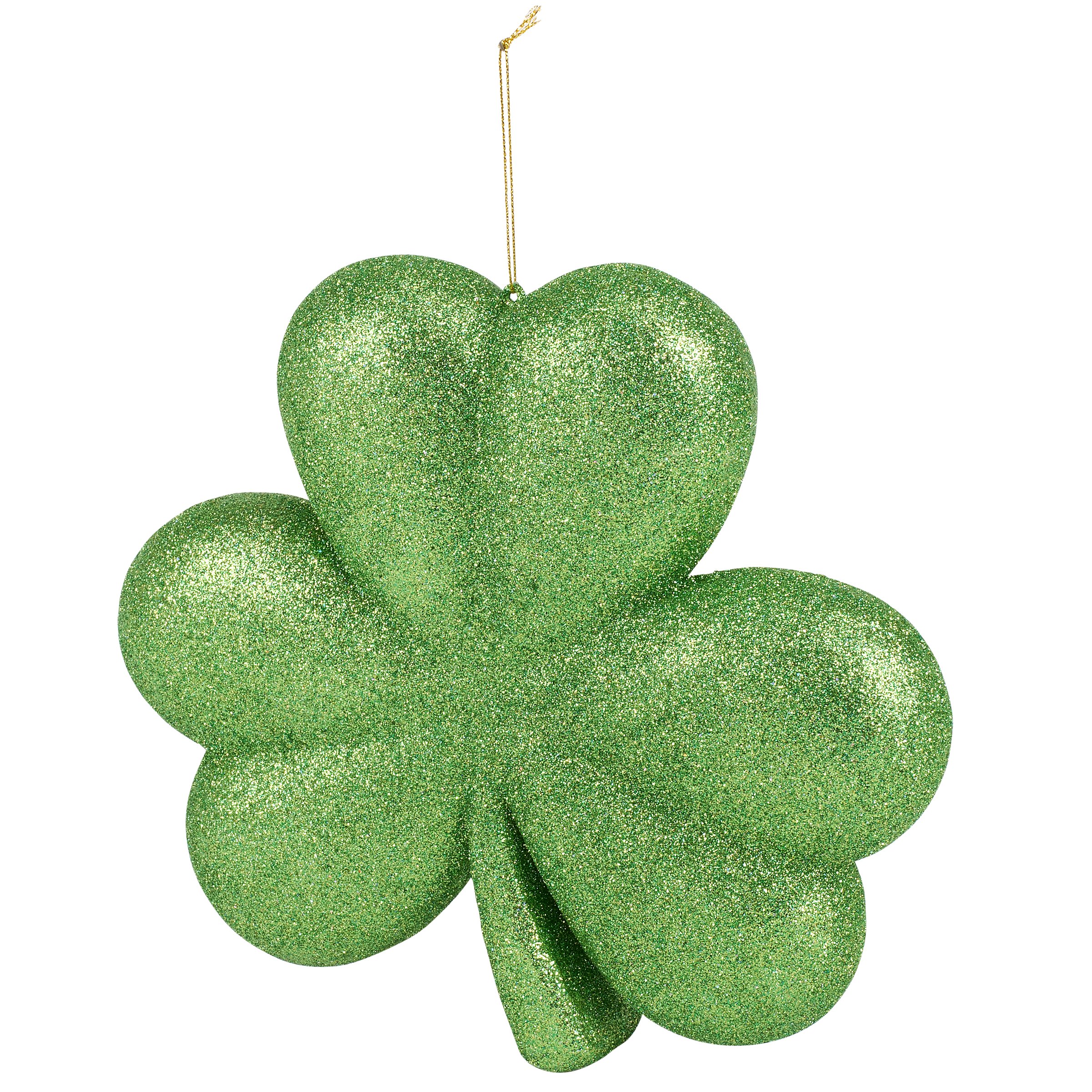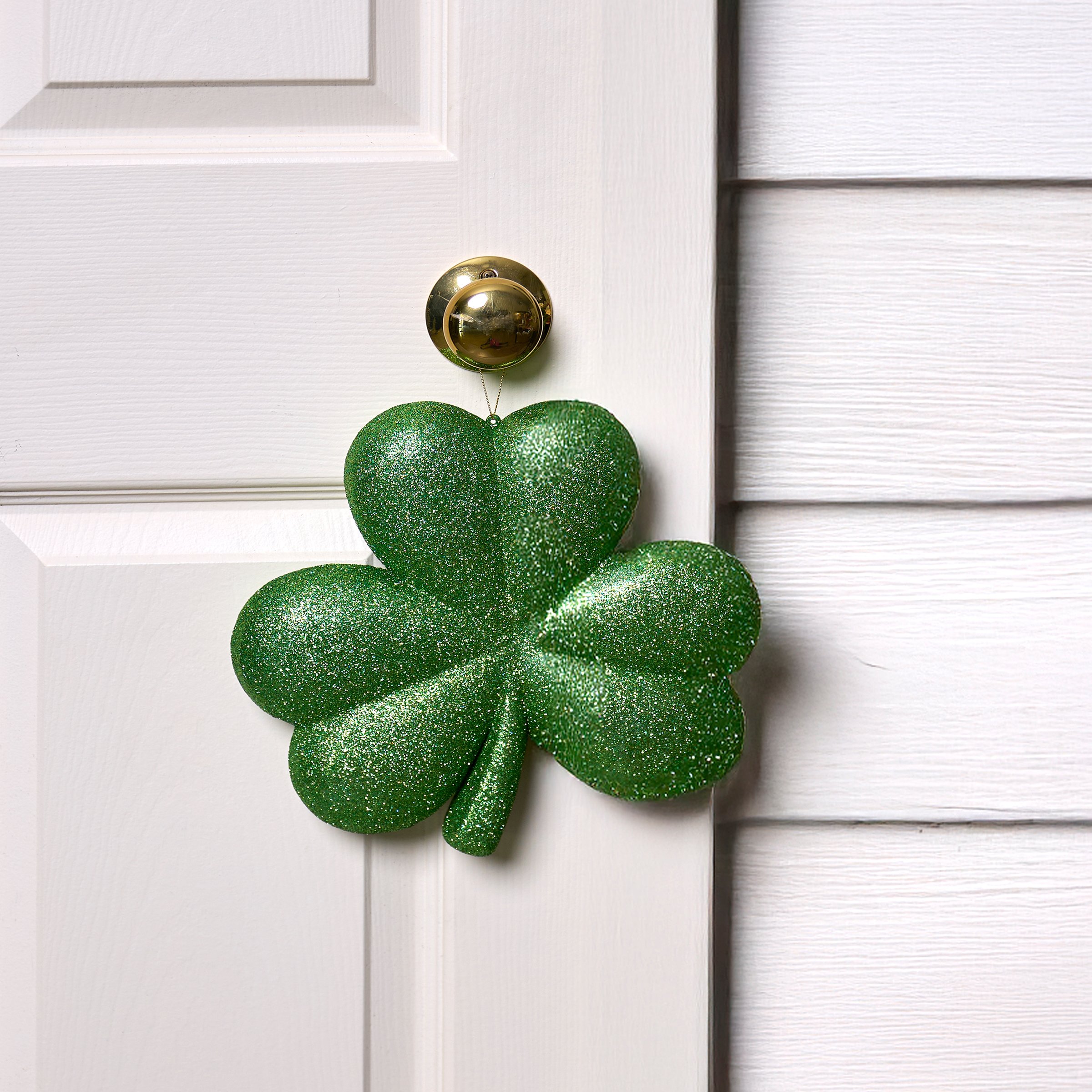 A hanging decor piece from our St. Patrick's Day Collection displaying a dimensional shamrock design with glitter finish. Our hanging Shamrock decor is easy to hang for display via attached gold string hanger. A fun St. Patrick's Day home accent perfect for seasonal decorating.