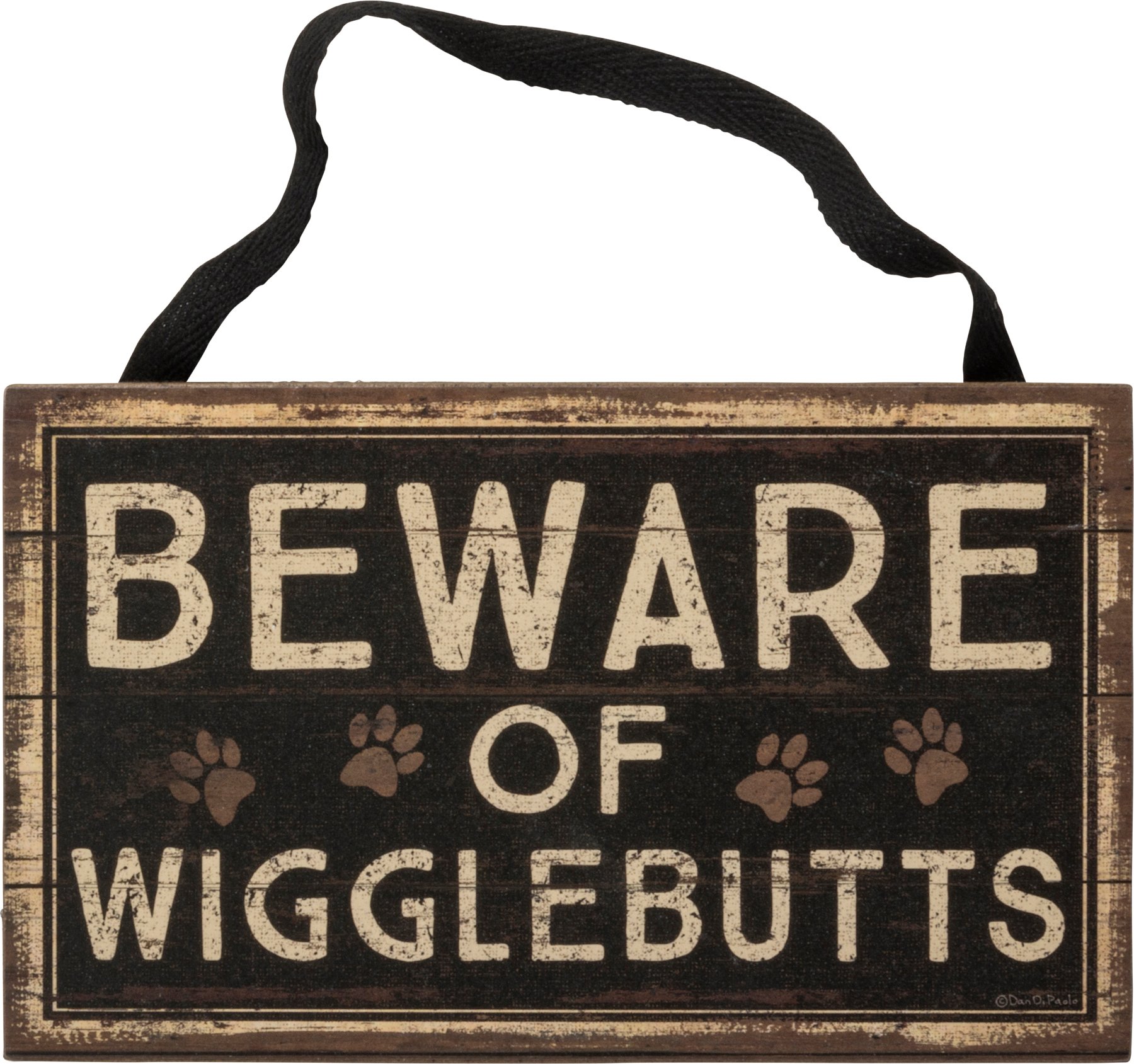 A wooden hanging sign from our Pet Collection displaying a rustic pet themed design with humorous sentiment that reads "Beware Of Wigglebutts." Design features distressed details with coordinating black color on sides and back. Our Wigglebutts hanging décor is easy to hang via cotton tape hanger attached to the top. A fun pet-themed home accent.