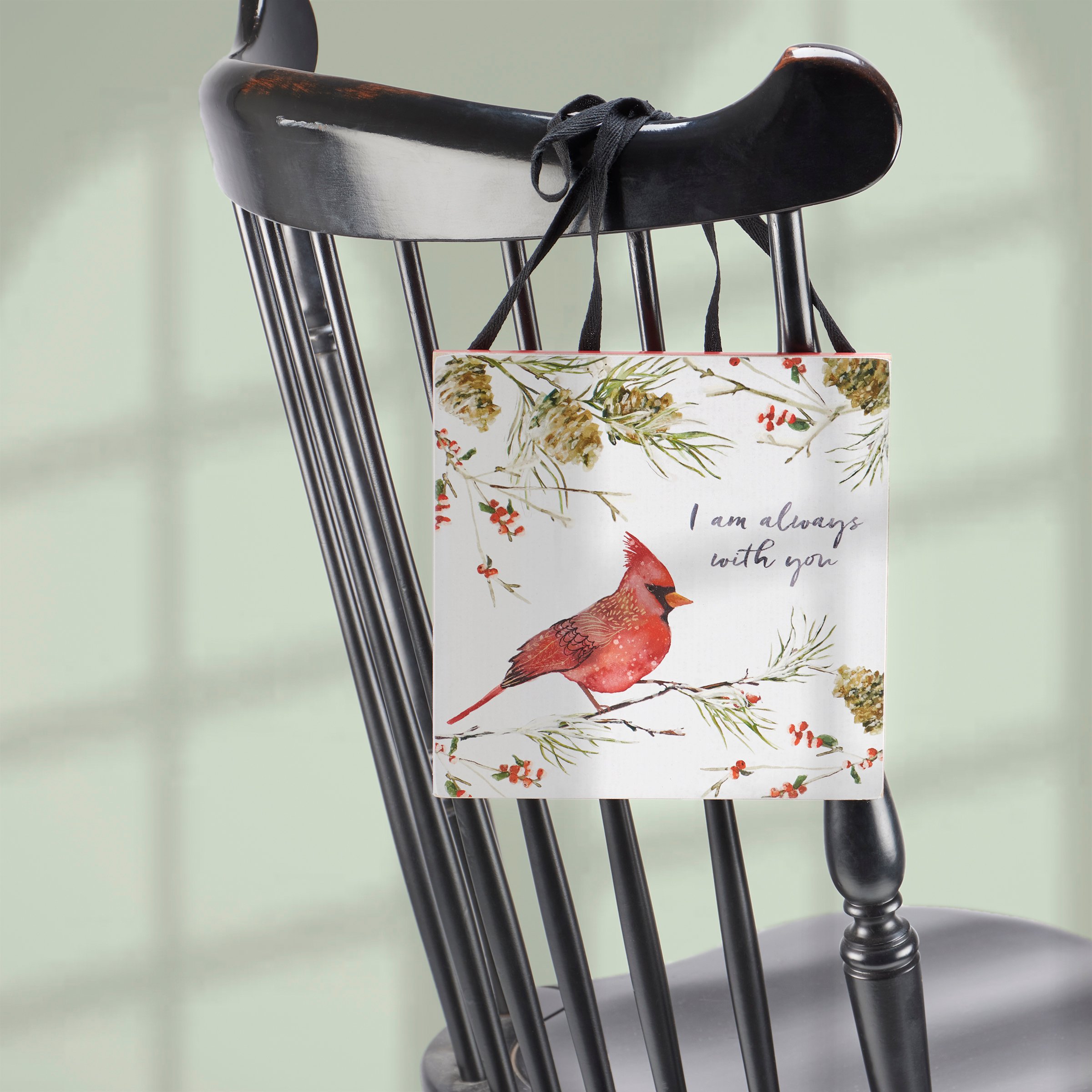 A wooden hanging sign from our Christmas Collection displaying a hand painted design of a cardinal and winter branches with heartwarming sentiment that reads "I Am Always With You." Sign features coordinating red color on the sides and back. Our Cardinal hanging décor is easy to hang via attached black cotton tape hanger. An inspirational home accent that can hang on a wall or be used to embellish a chair to memorialize a lost loved one's place at a gathering.