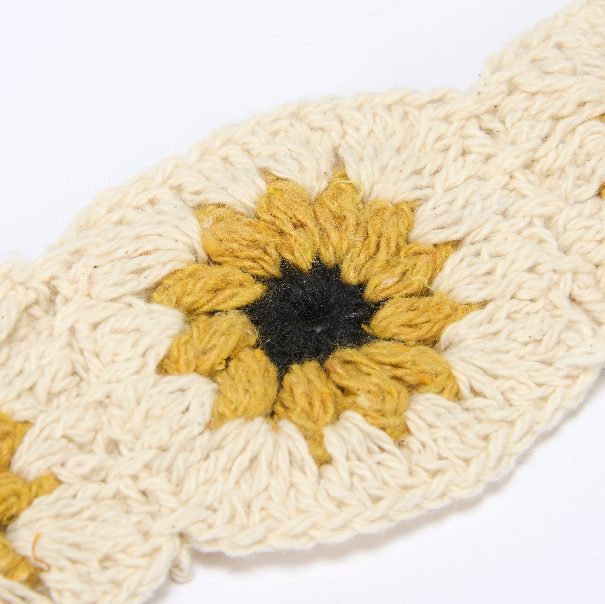 A stylish cotton headband from our Cottagecore Collection displaying a crochet inspired design of sunflowers for a unique handmade style. Crochet headband features five sunflower designs across the top where it sits on the head leading to cotton ties to create the perfect fit. Our Sunflowers headband is a cute nature-themed hair accessory great for gifting.