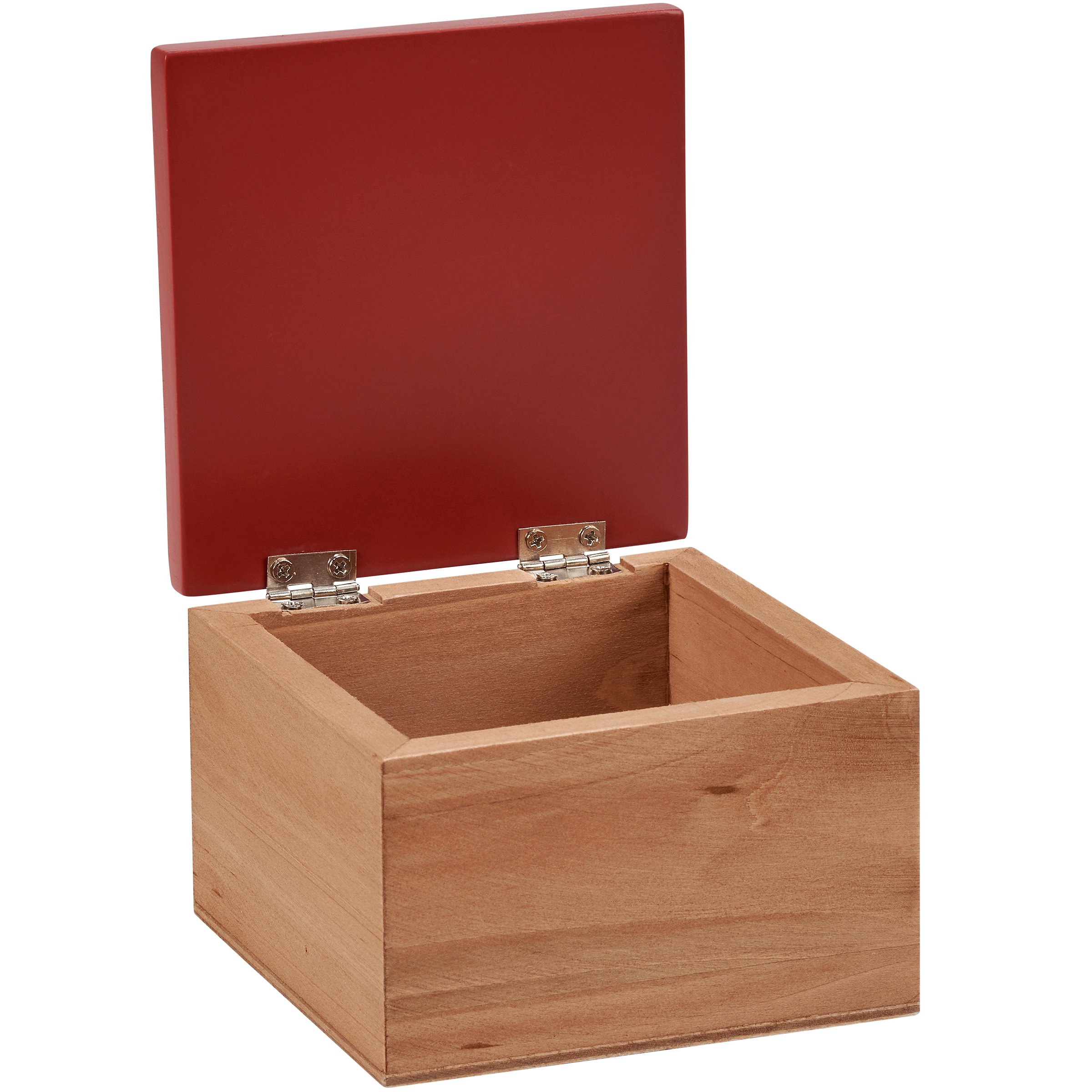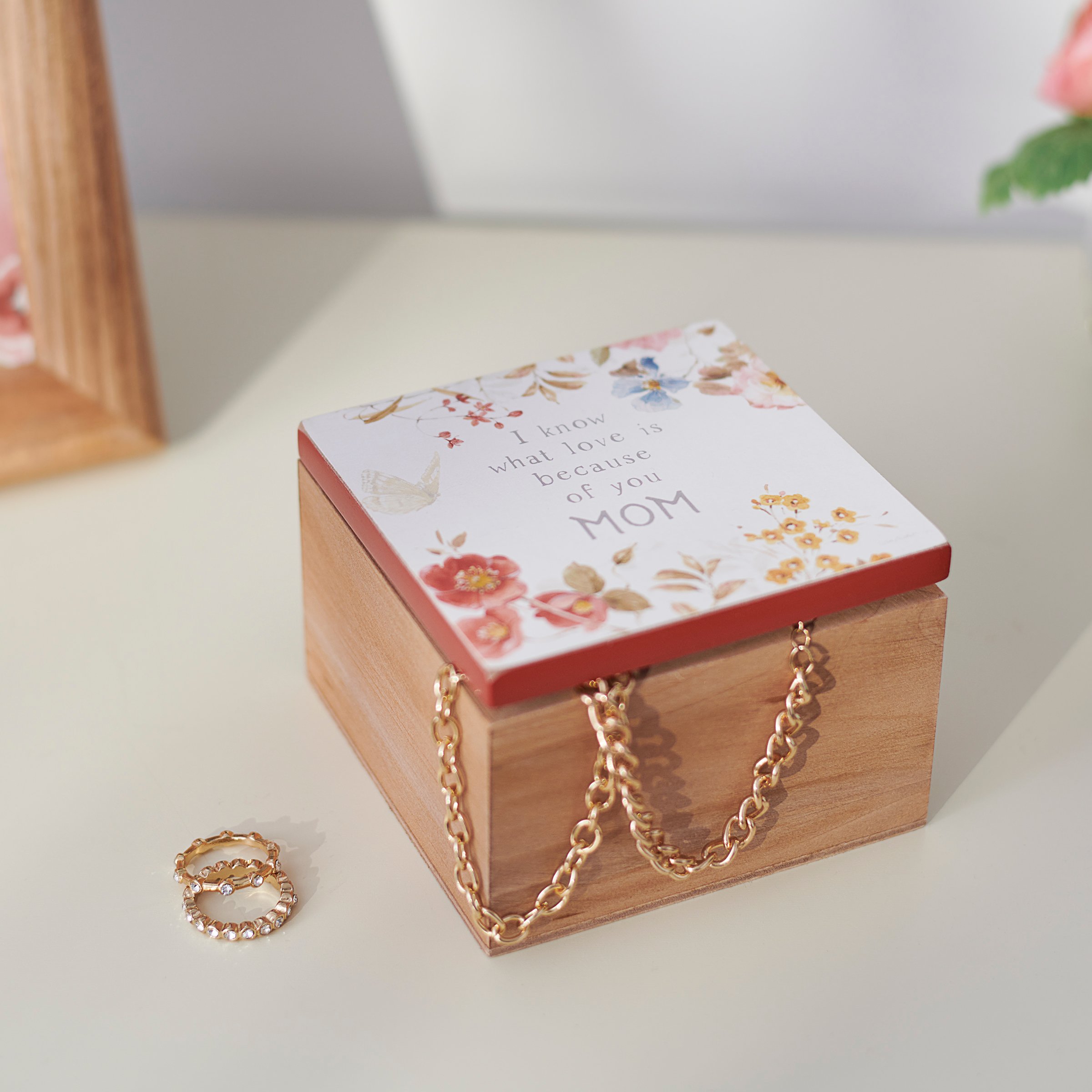 A wooden hinged box from our Mother's Day Collection displaying an elegant hand painted design on the lid with coordinating red color on the sides and bottom. Design features a butterfly and colorful flowers surrounding a heartwarming sentiment that reads "I Know What Love Is Because Of You Mom." Box is made of natural wood for added interest. Our Because Of You Mom hinged box is perfect for storing daily keepsakes. A lovely gift perfect for Mother's Day or as a functional everyday home accent.
