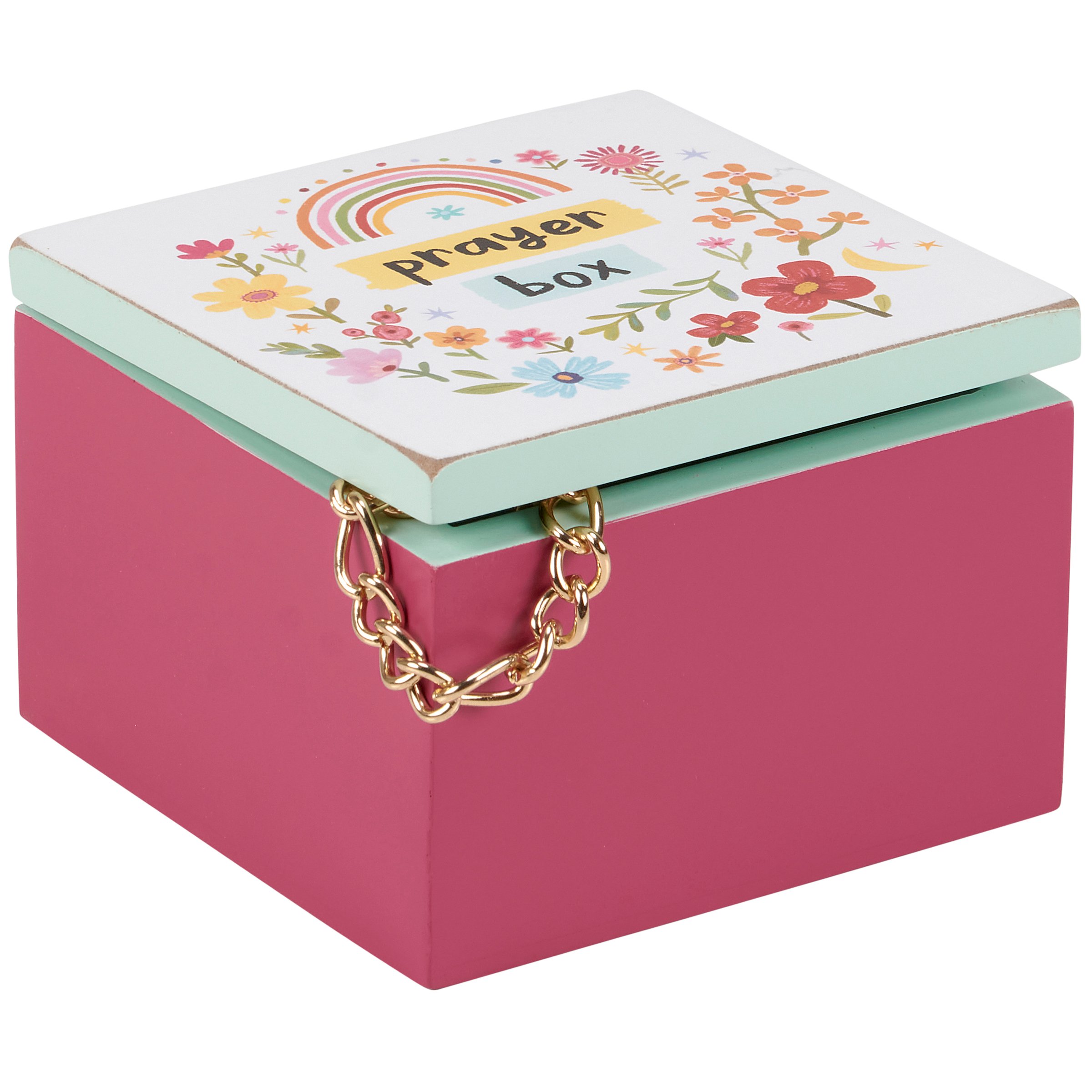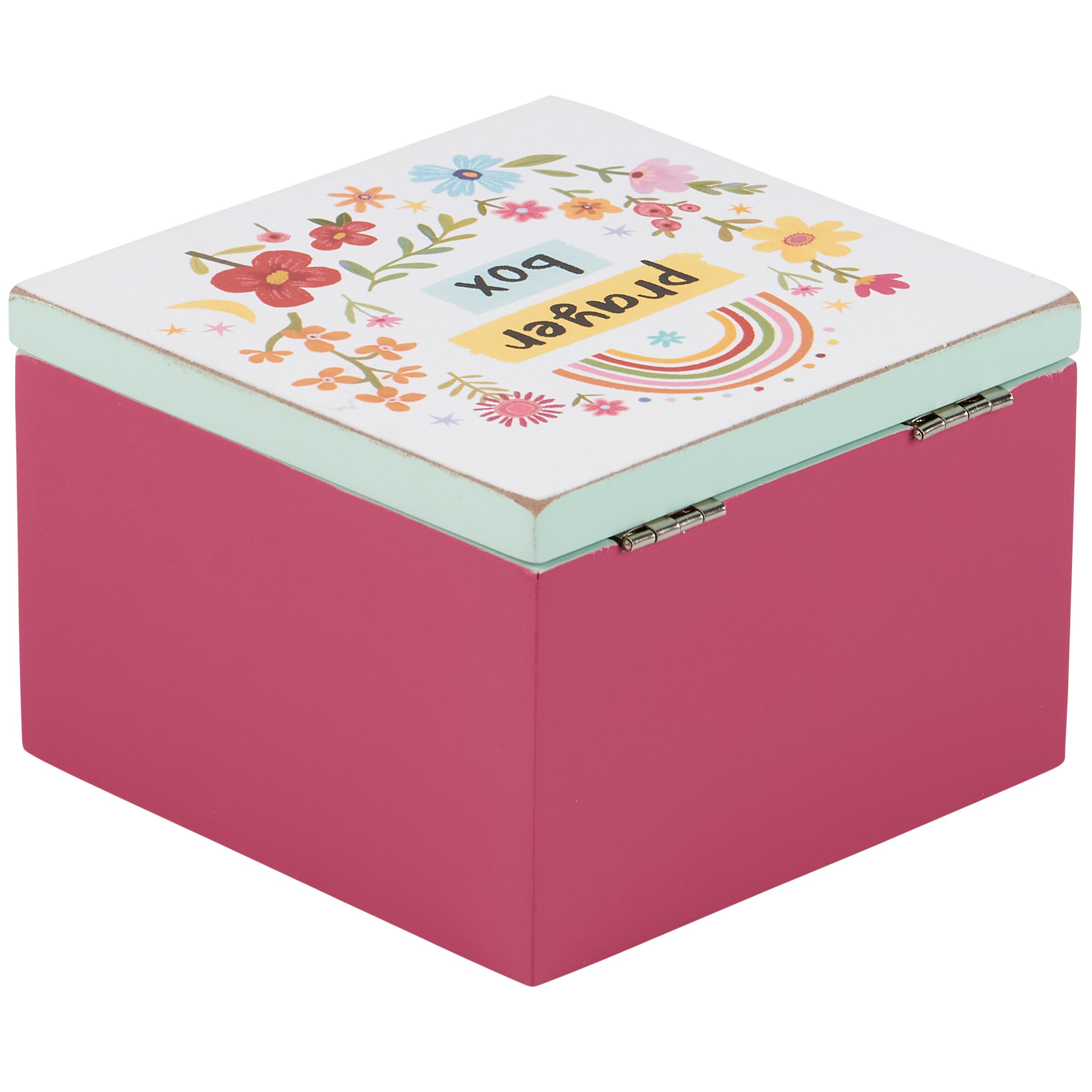 A decorative hinged box from our Inspiration & Blooms Collection displaying vibrant hand illustrated designs of a rainbow and florals surrounding a "Prayer Box" sentiment on the lid that encourages placing written wishes or prayers for safe keeping. Hinged box features coordinating green color inside and pink color on the sides. Box is made of natural wood for added interest. Our Floral Prayer hinged box is an inspirational home accent great for gifting.