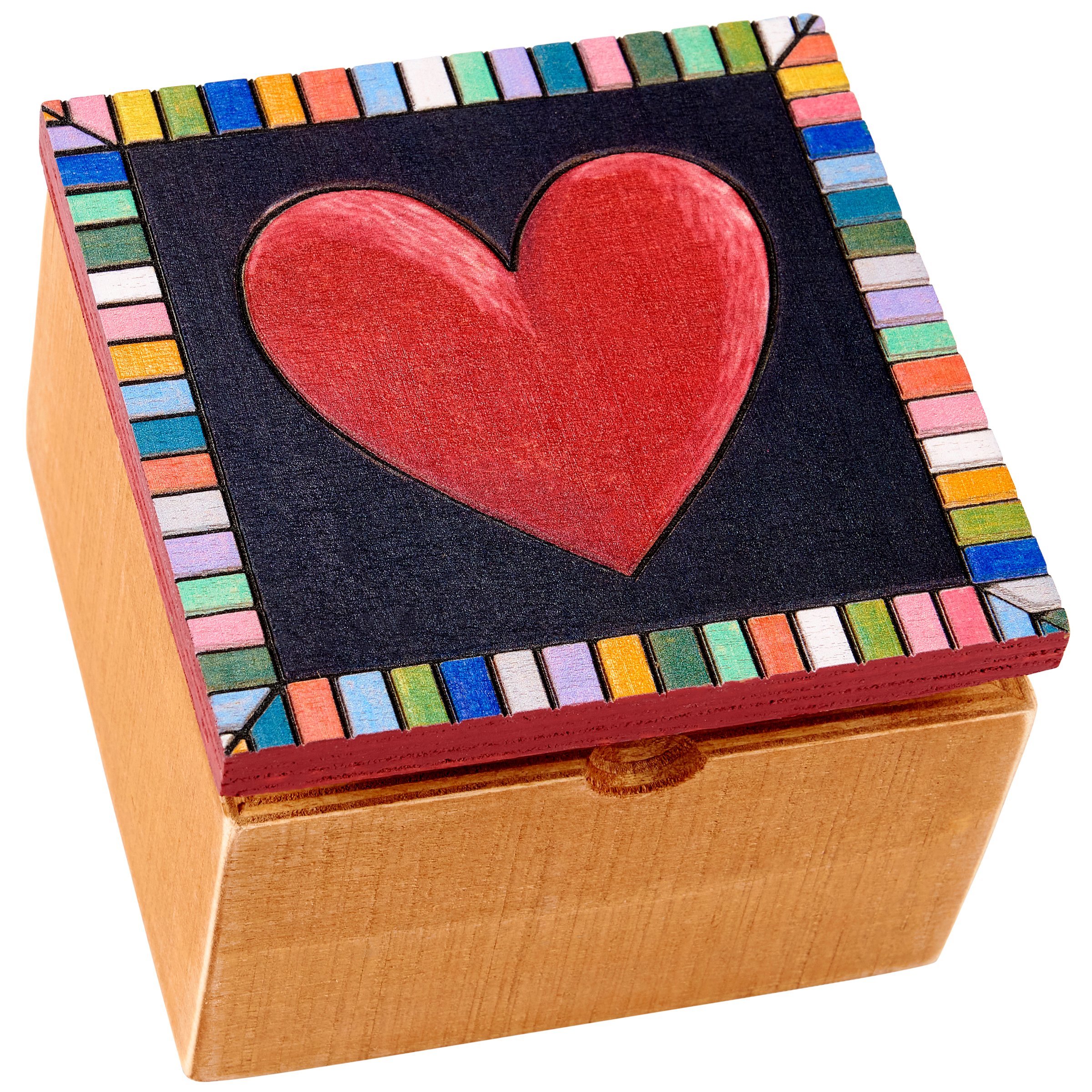 A decorative hinged wooden box featuring woodburned heart design and multicolor border. Perfect for storing treasured keepsakes. This Heart hinged box is great for gifting!