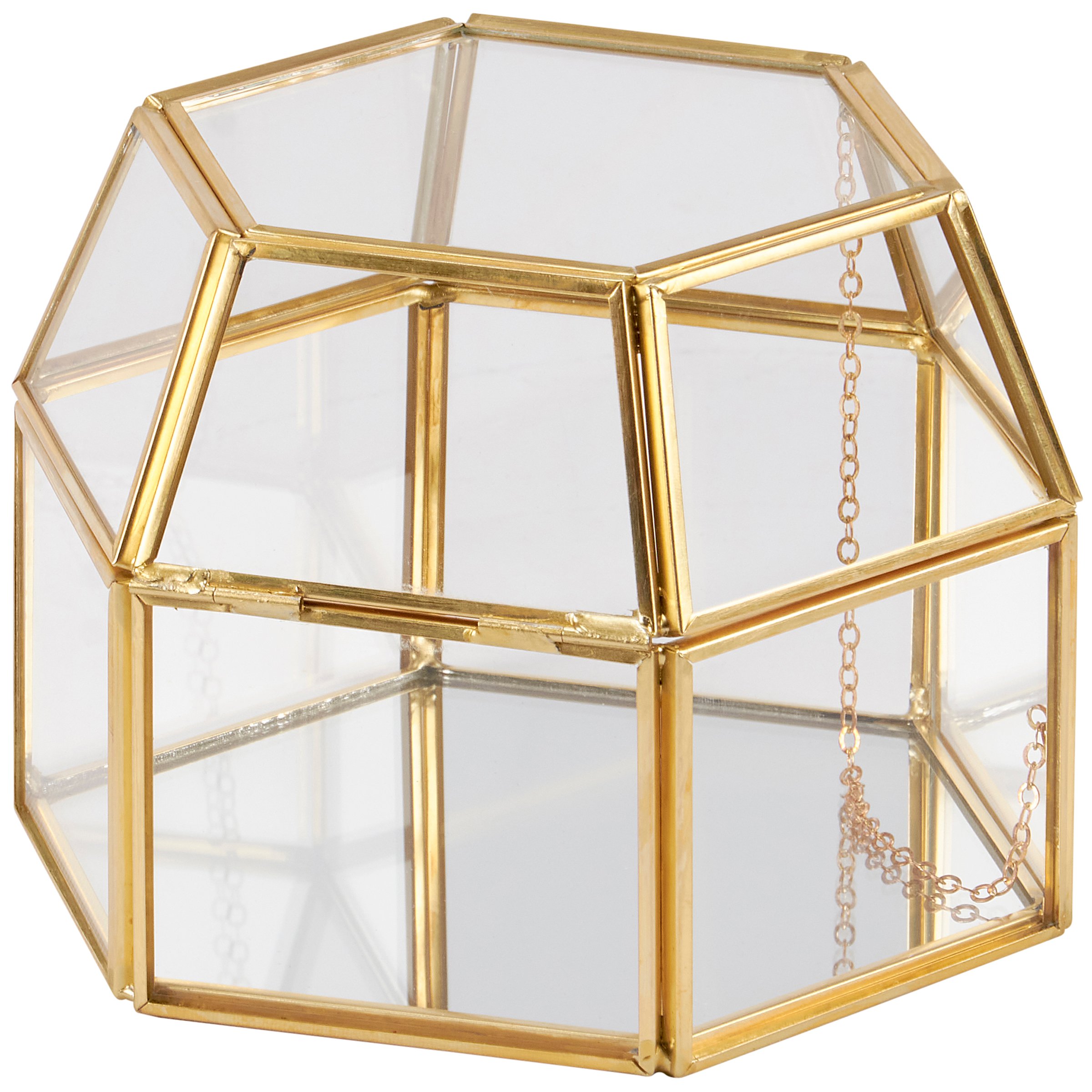 A decorative hinged box from our Home Collection displaying a hexagon shape and dome lid made with glass and brass trim for an antique style. Hinged box features a mirror bottom and brass chain to hold lid open. Our glass Hexagon hinged box is a unique vintage inspired home accent perfect for storing daily keepsakes or decorative items.