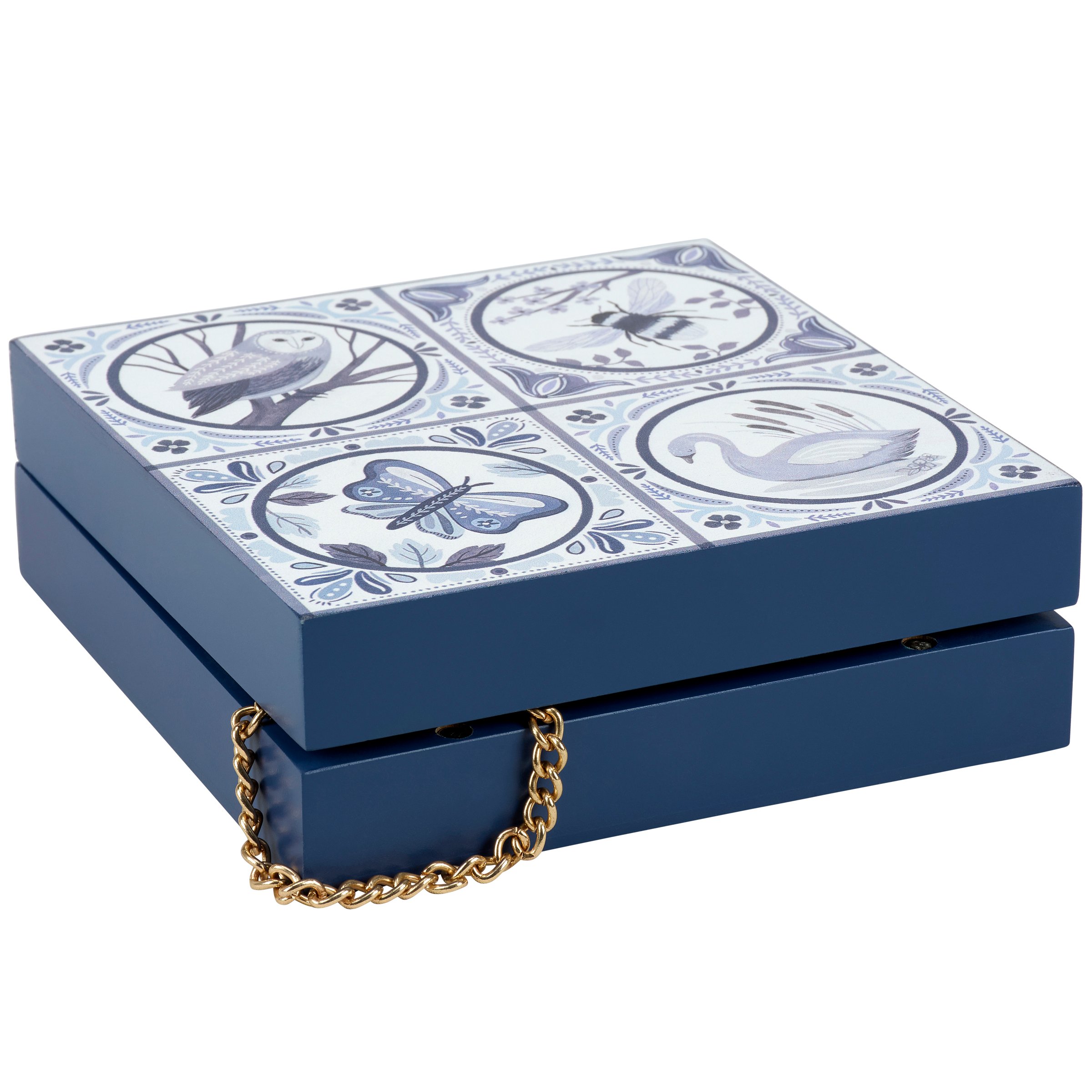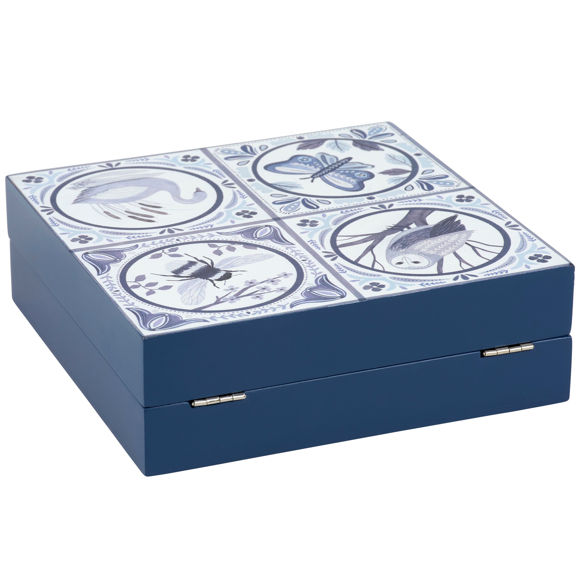 A wooden hinged box from our Home Collection displaying tile inspired designs featuring various nature scenes in a calming indigo color palette on the lid with coordinating blue color on the sides. Each tile design is replicated from original hand illustrated art. Hinged box is made with natural wood and features a magnet closure to keep items secure. Our Indigo Tile hinged box is perfect for storing daily keepsakes as everyday home decor. A stylish home accent that is great for gifting.