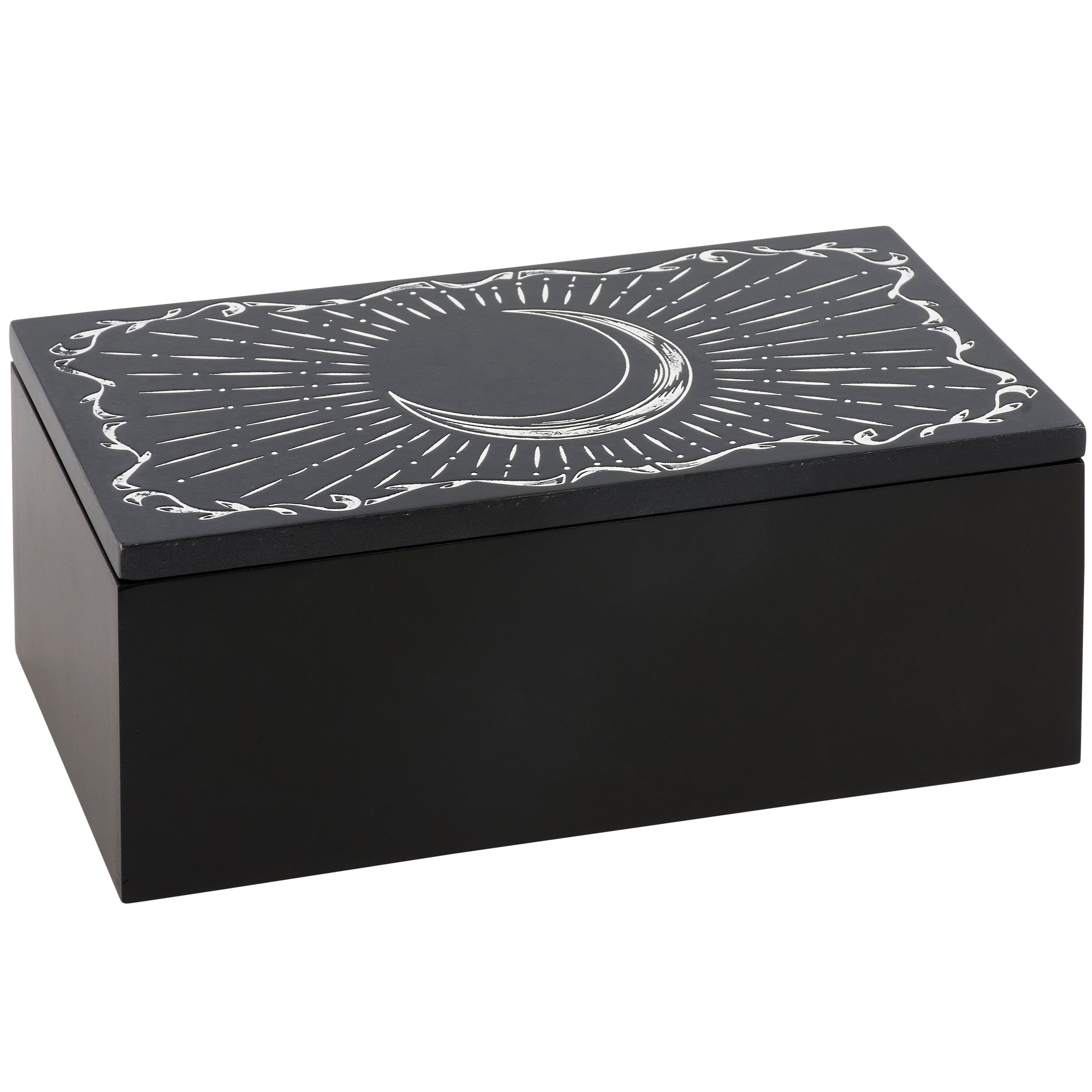 A wooden hinged box from our Mystical Collection displaying a hand illustrated moon design with burst accents on the lid and coordinating black color on the sides. Box is made of natural wood for added interest. Our Moon Burst hinged box is a unique celestial-themed home accent perfect for storing daily keepsakes.