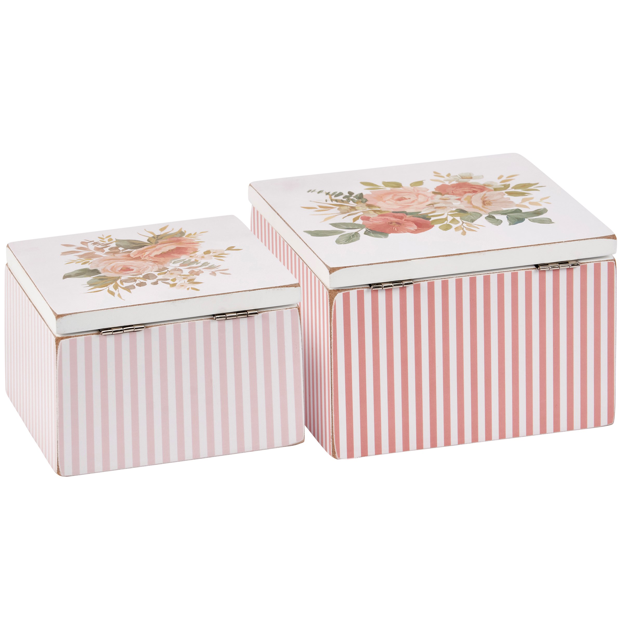 A set of two nesting hinged boxes from our Watercolor Collection displaying charming designs of cabbage rose bouquets replicated from original art hand painted in a unique watercolor style. Hinged box designs feature coordinating pink stripe patterns on the sides with subtle distressed details on the edges. Our Rose Bouquet hinged box set is a stylish home accent perfect for storing keepsakes or for desk organization.