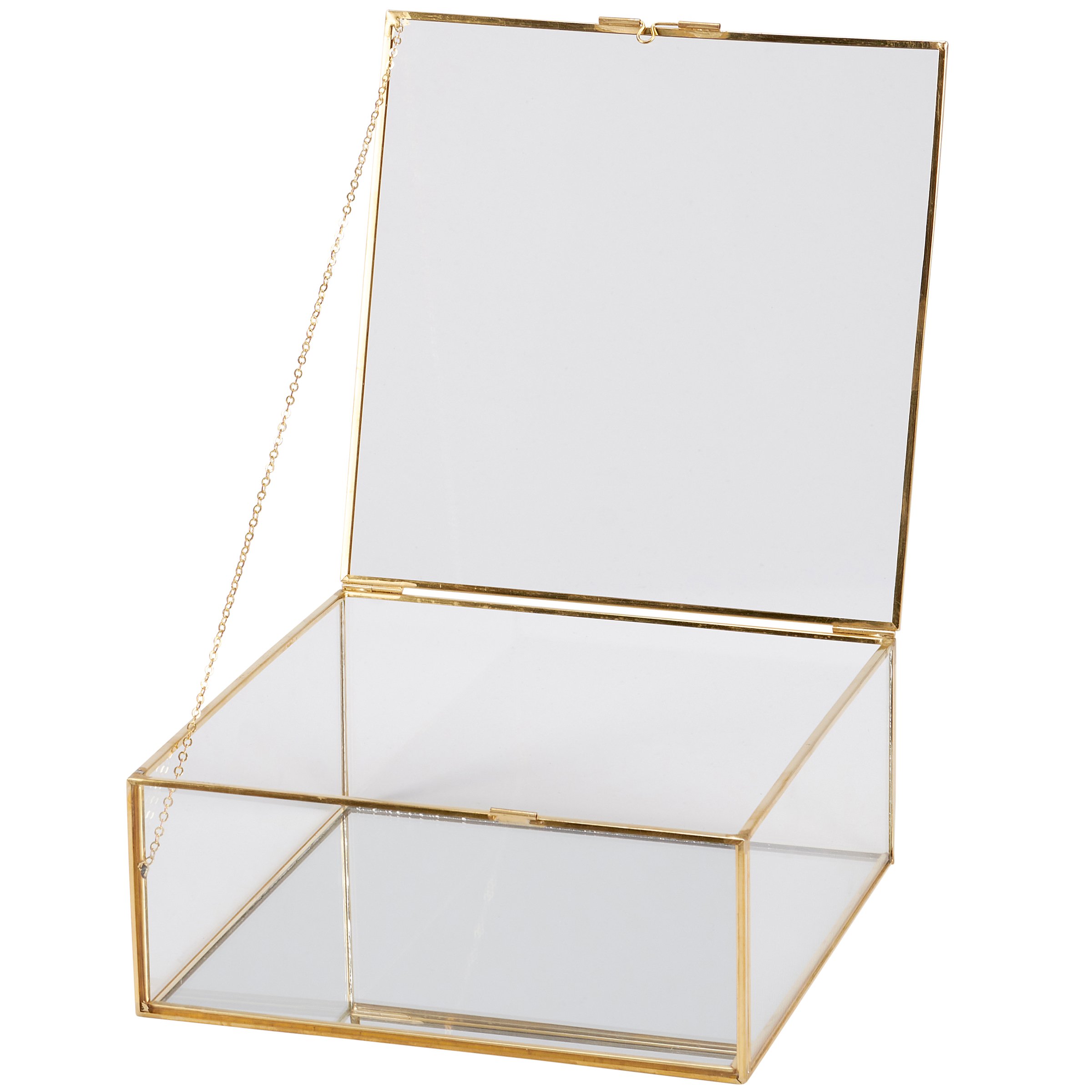 A set of decorative hinged boxes from our Home Collection including 2 individually sized rectangle shapes made with glass and brass trim for an antique style. Each hinged box features a mirror bottom and brass chain to hold lid open with a latch to secure closed. Our glass Square hinged box set is a unique vintage inspired home accent perfect for storing daily keepsakes or decorative items.