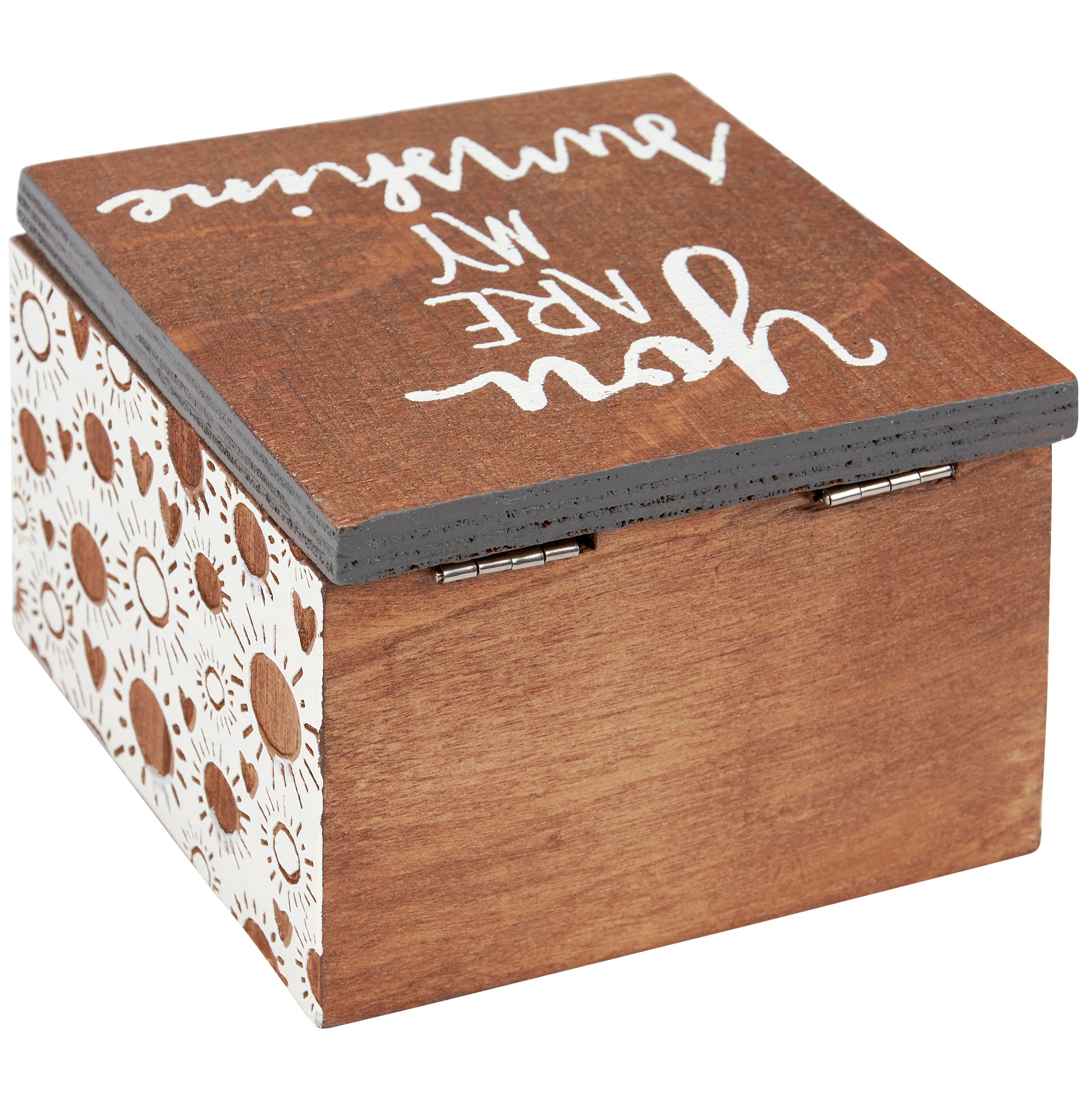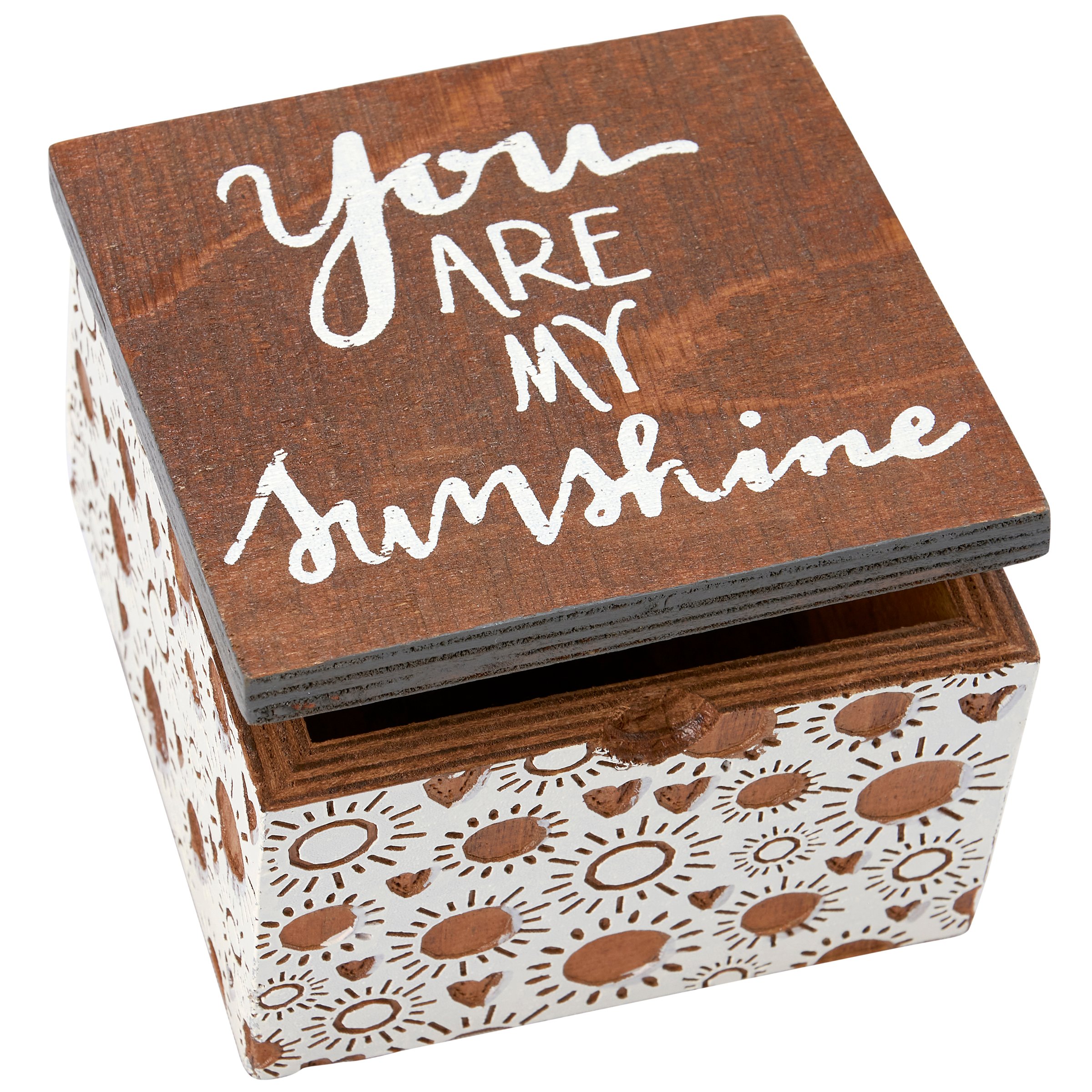 A wooden hinged box featuring debossed sun and heart designs and hand lettered "You Are My Sunshine" sentiment.