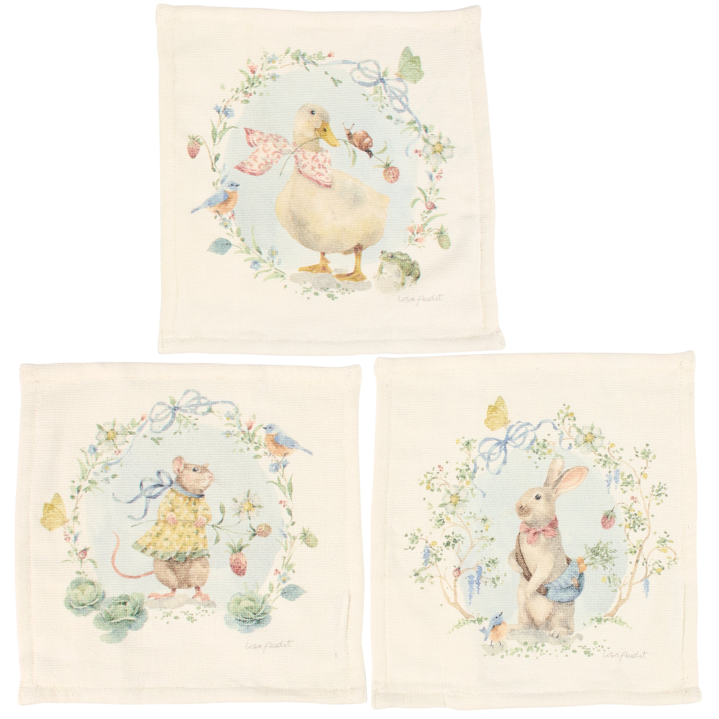 A cotton towel set from our Baby & Kids Collection that includes a children's hooded bath towel and three washcloths displaying coordinating garden animal designs inspired by children's storybook illustrations. Garden designs are replicated from original art hand painted in a delicate watercolor style. Children's hooded towel features absorbent terrycloth and an attached hood with bunny ear accents displaying a green gingham pattern. Washcloths display all-over designs on the front of each including a rabbit, duck, and mouse. Our Garden Friends hooded towel set is conveniently machine washable for easy cleaning. Towel set is neatly packaged together with cotton tape displaying towel ears and washcloth designs as well as a product information card making it great for gifting. Recommended for ages 0-24 months. A cute garden-themed gift set perfect for baby showers or everyday moments.